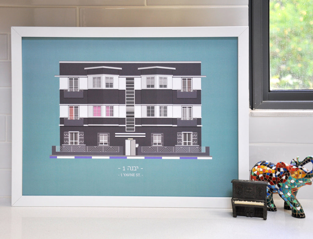 This is a unique poster of an original illustration of the building at 1 Yavne St. in Tel Aviv on a dark turquoise background. This building is part of the the Eclectic style which was active during the 1920's and 30’s.