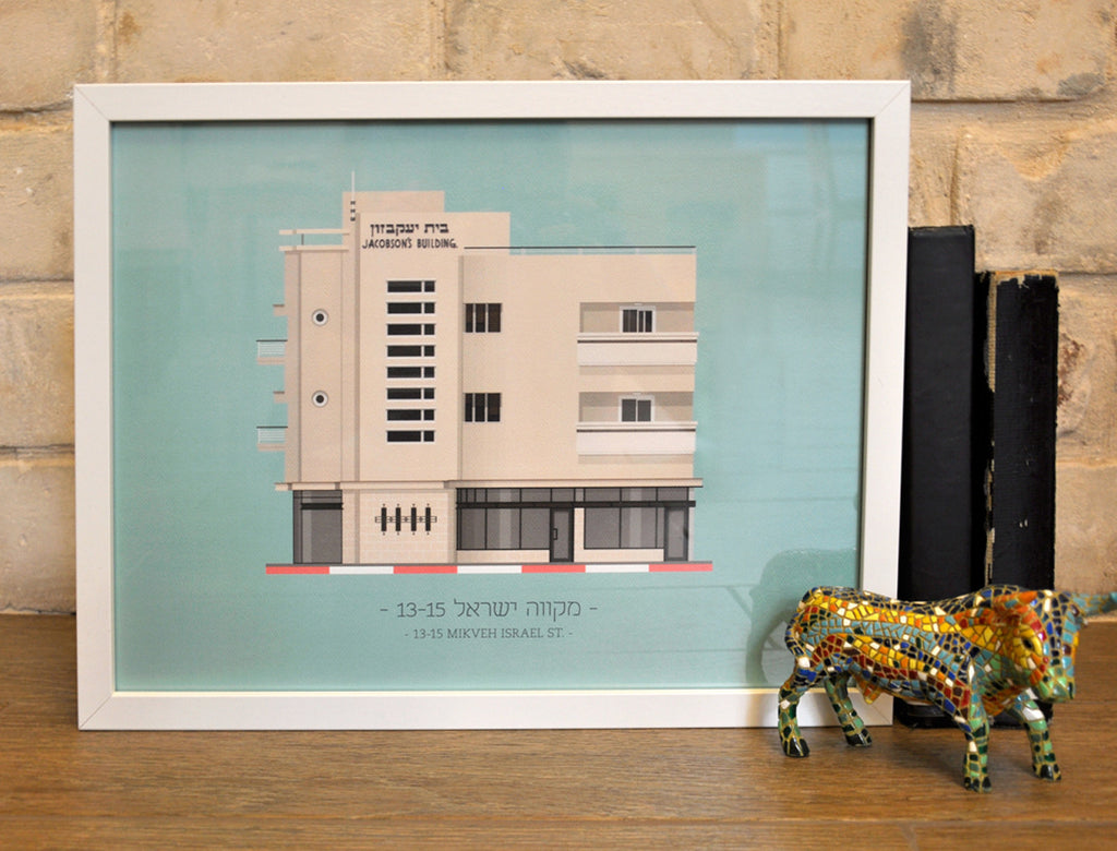 This is a unique poster of an original illustration of the building at 13-15 Mikveh Israel St. in Tel Aviv on a pastel light blue background. This building is a symbol of the the International style movement which was the major architecture movement during the 1930-50's and led UNESCO to name Tel Aviv as a World Heritage Site for its International style architecture in 2003.
