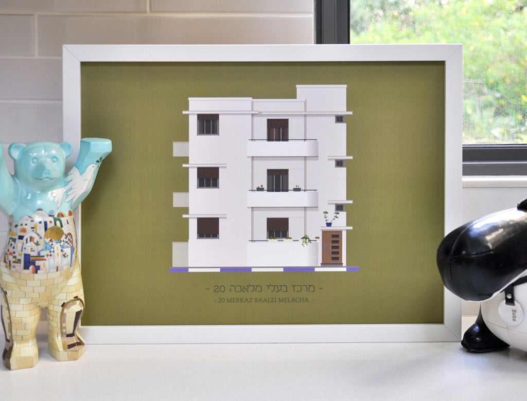 This is a unique poster of an original illustration of the building at 20 Merkaz Baalei Melacha St. in Tel Aviv on an olive background. This building is a symbol of the the International style movement which was the major architecture movement during the 1930-50's and led UNESCO to name Tel Aviv as a World Heritage Site for its International style architecture in 2003.