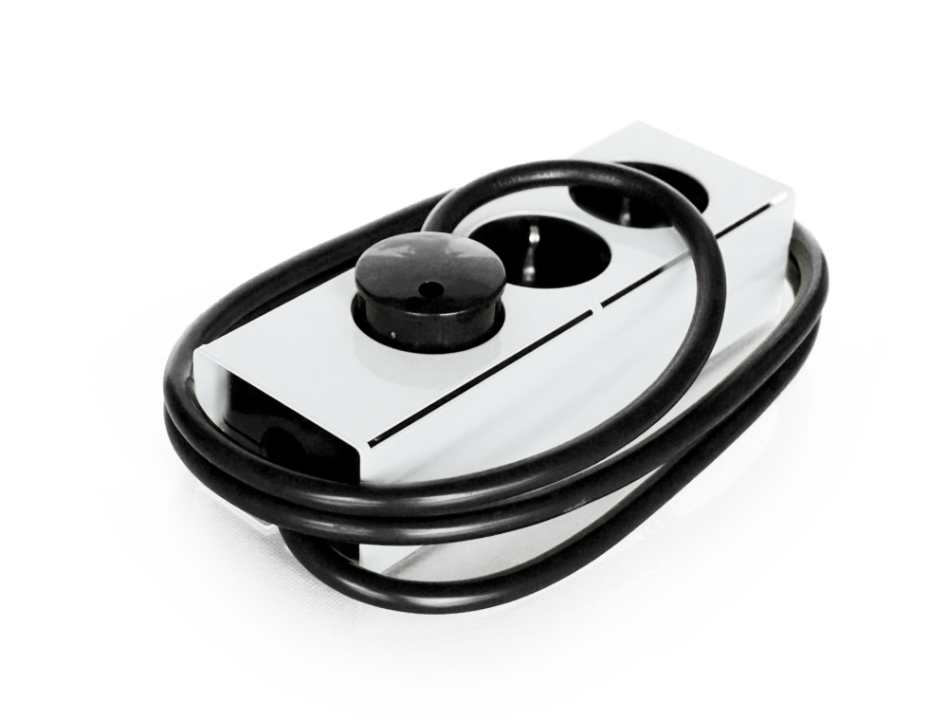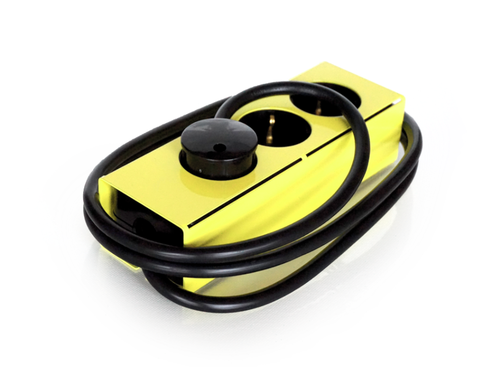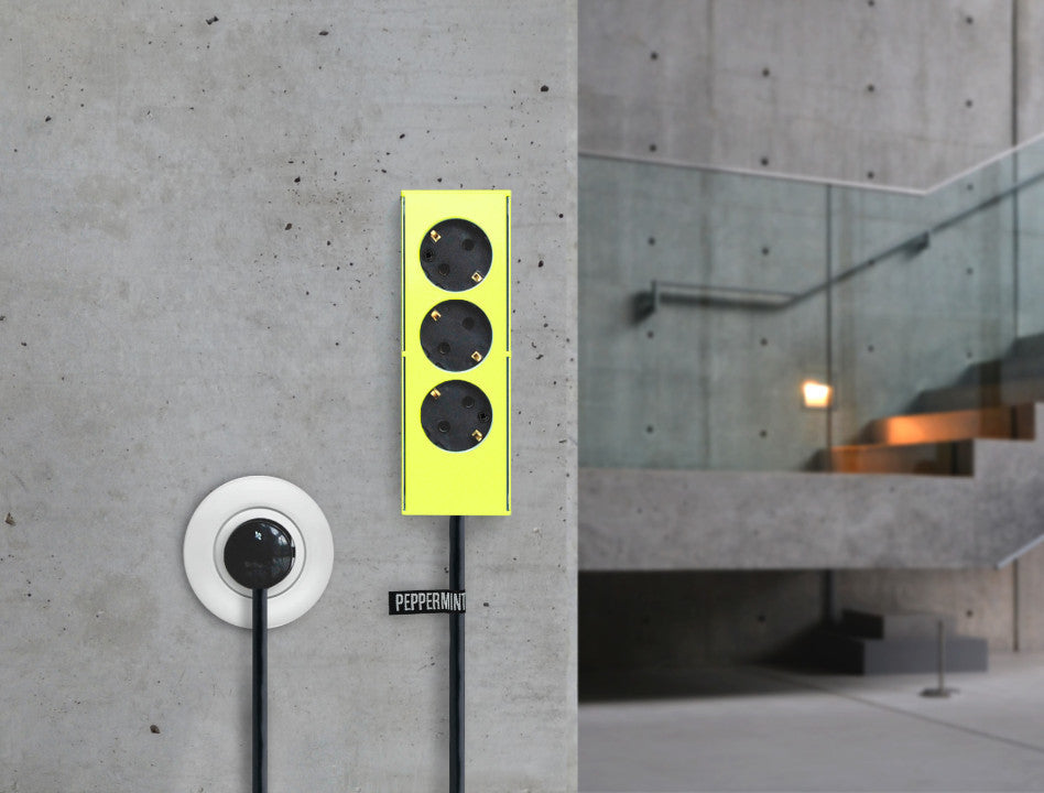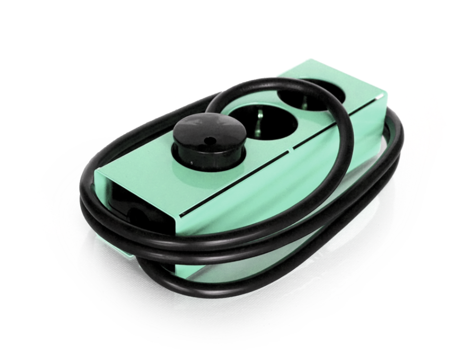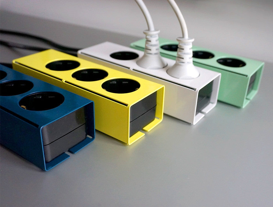 The Powerstrip of steel is designed and made in Germany. It is available in 4 color variations of powder-coated steel cases. The Socket-strip can also be mounted on a table or wall.