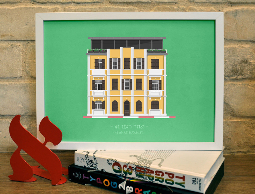 This is a unique poster of an original illustration of the building at 41 Ahad Ha’am St. in Tel Aviv on a fresh mint background. This building is part of the the Eclectic style which was active during the 1920's and 30’s.