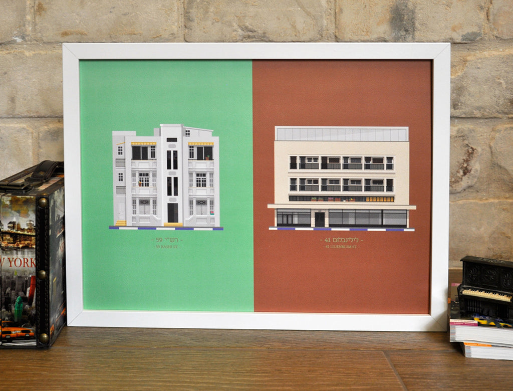 This is a unique poster of two original illustrations of the buildings at 59 Rashi St. & 41 Lilienblum St. in Tel Aviv on bright green and brown backgrounds. 59 Rashi St. is a building who's a part of the the Eclectic style which was active during the 1920's and 30’s. 41 Lilienblum St. is part of the International style architectural movement which was the major architecture movement during the 1930-50's and led UNESCO to name Tel Aviv as a World Heritage Site for its International style architecture in 2003.