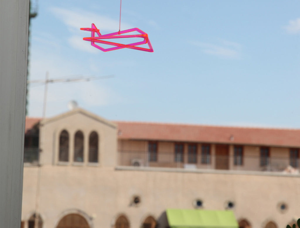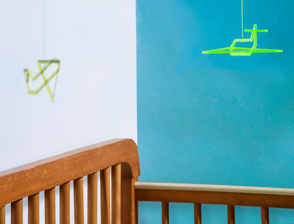 Airplane silhouette turns into a living 3D sketch. A different angle reveals itself in every movement it makes, creating space for imagination. Ideal for hanging near the window. The mobile is very light so it spins and moves with the breeze without getting tangled. Comes in cool neon shade, in the daylight it reflect color stripes on the wall & in night time it drops a pair of new airplane shadow.