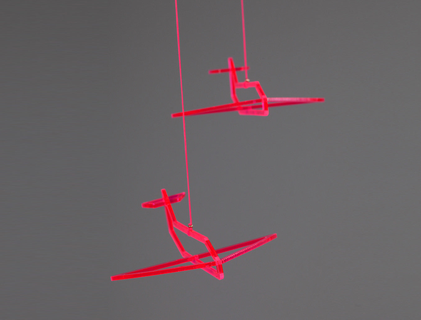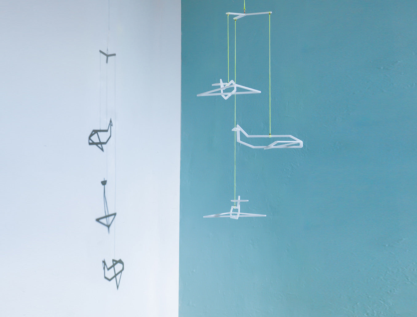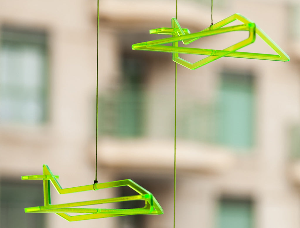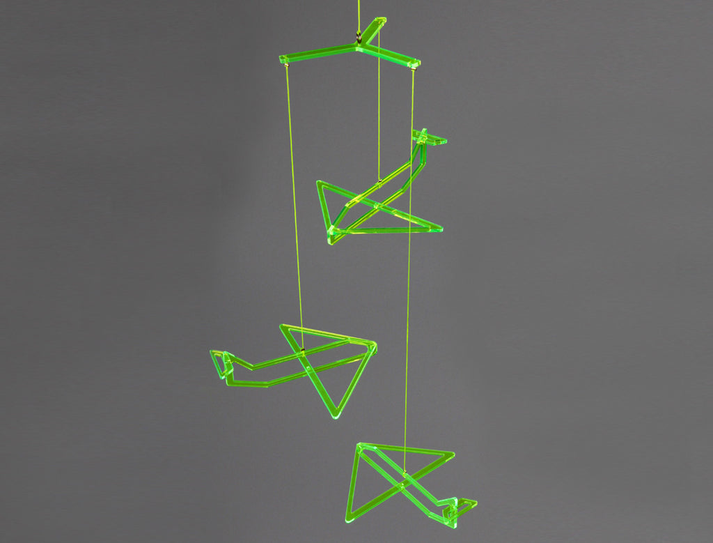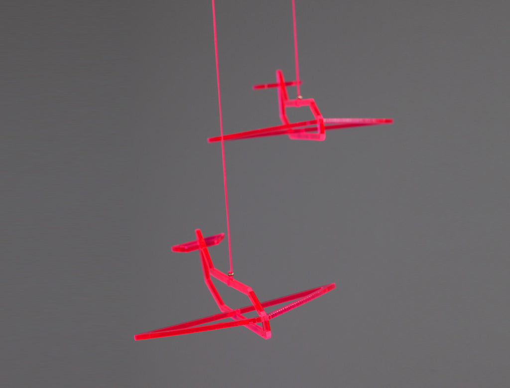Airplane silhouette turns into a living 3D sketch. A different angle reveals itself in every movement it makes, creating space for imagination. Ideal for hanging near the window. The mobile is very light so it spins and moves with the breeze without getting tangled. Comes in cool neon shade, in the daylight it reflects color stripes on the wall & in night time it drops a pair of new airplane shadow.