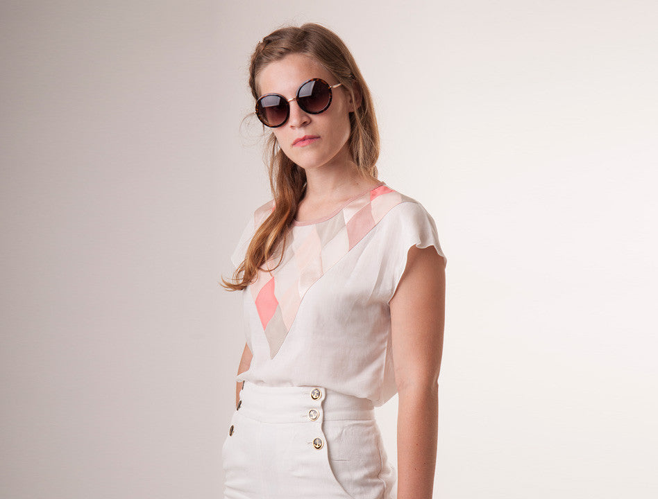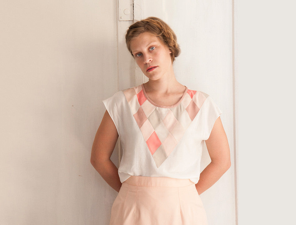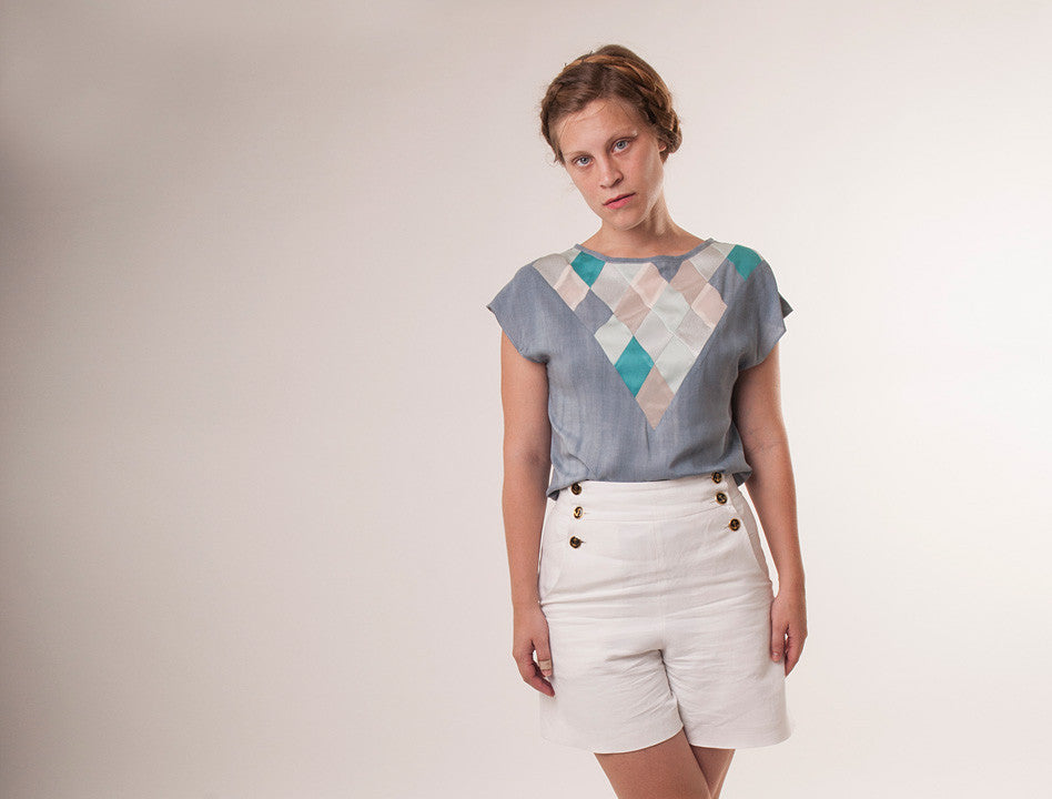 The shirt features a V shaped panel all made of handmade patchwork which creates a modern argyle diamond pattern. The shirt has a round neckline and short flared sleeves.