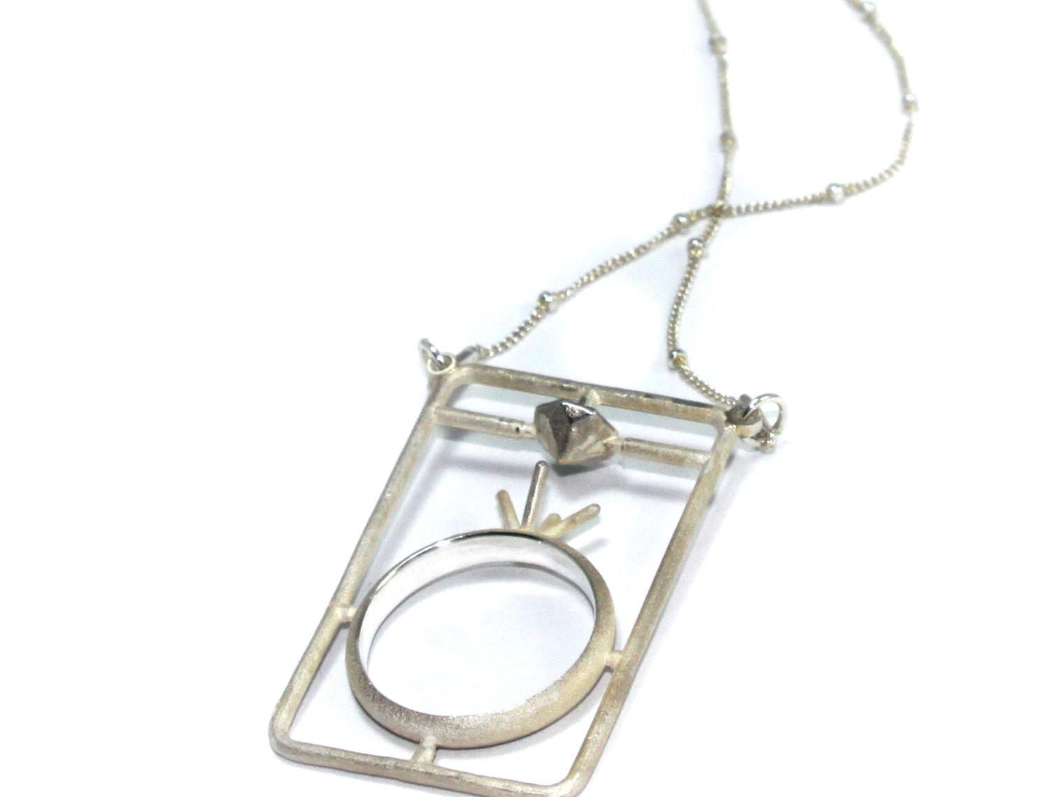 This piece features a pendant, styled as an assembly kit for a diamond ring, on a 70 centimeter long silver chain. Rough finish with mirror-like shine on the inner part of the ring. This item is from "THE ASSEMBLY LINE" collection. Inspired by toy assembly kits and industrial aesthetics. These forms are merged into the world of classic luxury jewelry, creating an ironic fusion with a touch of nostalgia.