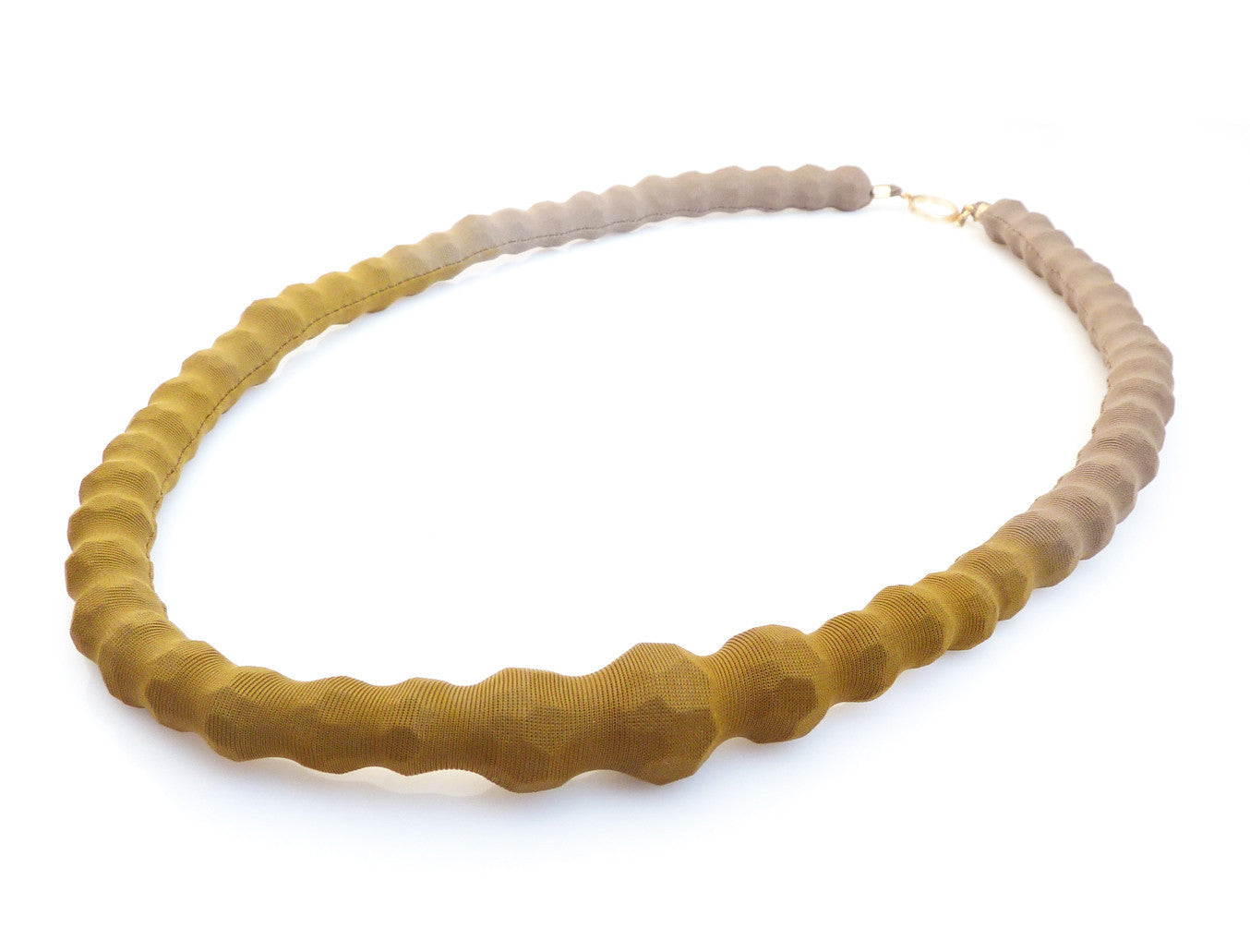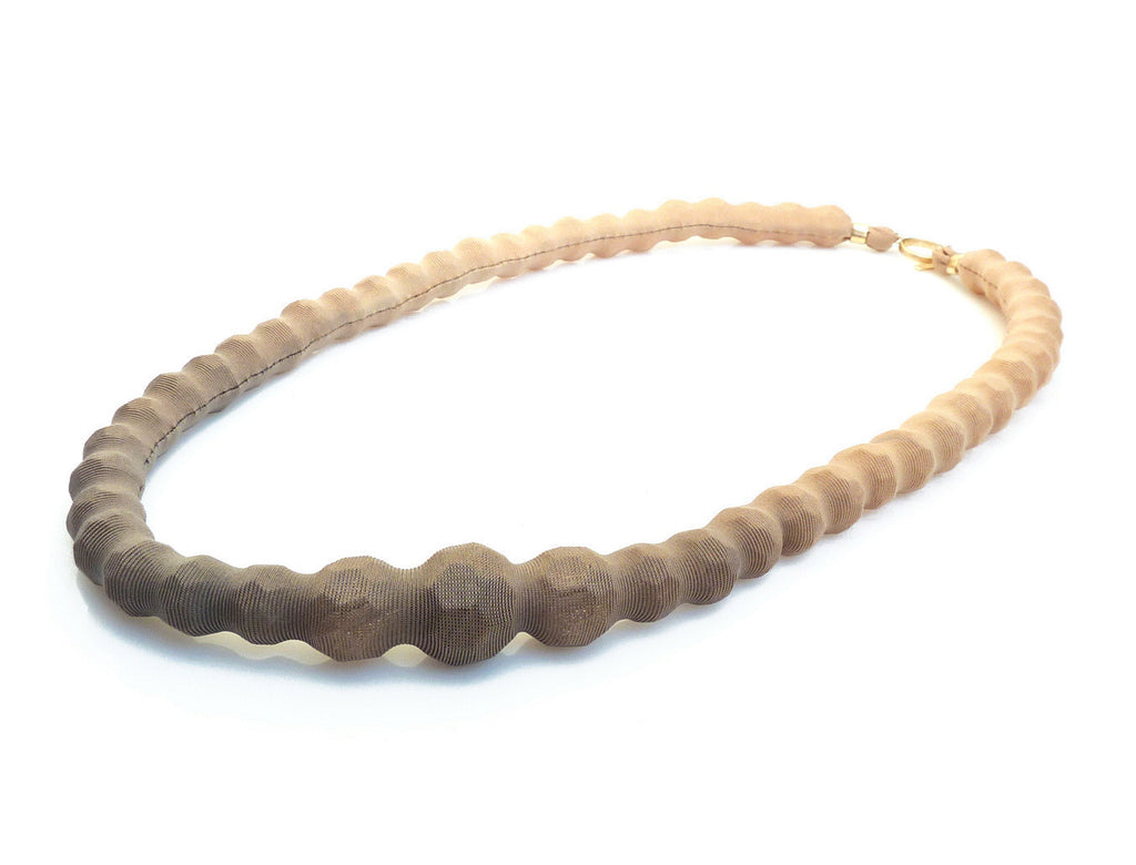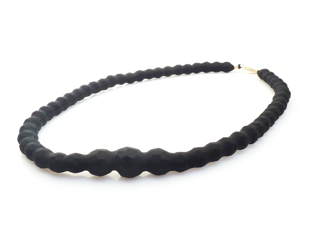 Long necklace, made of dyed fabric. The fabric wraps beads with ribs. The beads shine bright through the fabric. The necklace is very flexible and light.