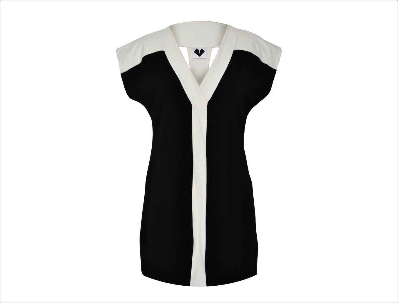 This dress has a box shape and should be loose on the body. It has beautiful cuts in the front and back. Made from viscose, a light fabric with a stretchy property. The white sections are made of lycra.