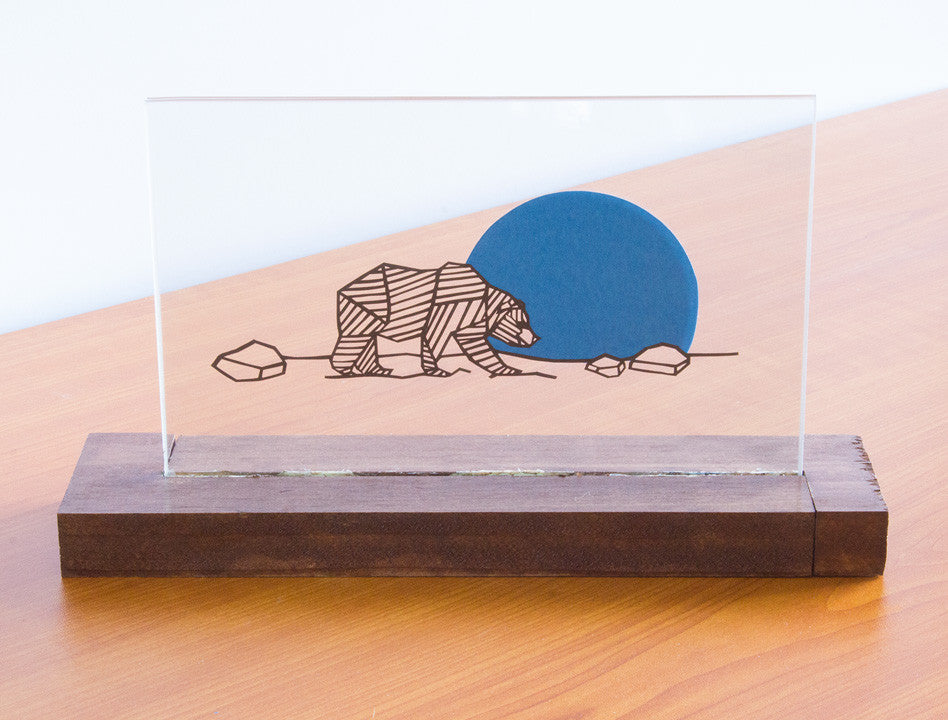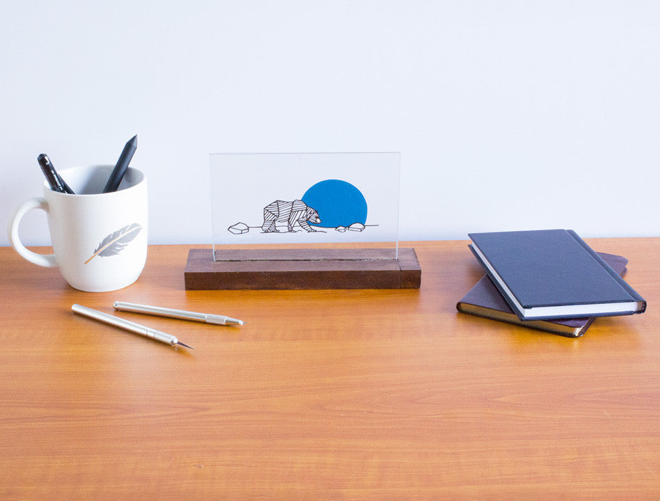 This paper cut out captures the beauty of a bear and the moon. Using only paper, an Xacto knife, and plenty of patience, this paper cut out is less than 6" wide. Perfect as a small ornament on your shelf, a simple yet attractive paper weight on your desk, or a reminder of the world outside your walls.