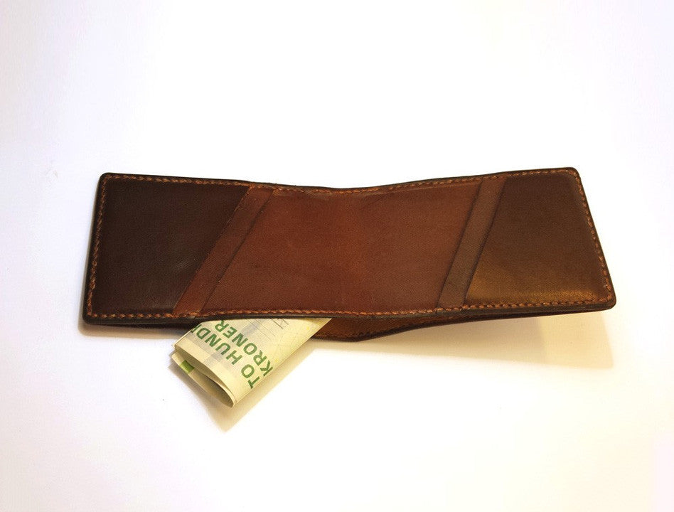 The mini flasher cardholder is made in hand dyed leather and hand stitched. The design is for the individual who wants a slim, stylish and practical bi fold cardholder that will age with grace. This is as barebones as a wallet can get. This stylish hand-stitched leather card holder is a real eye-catcher and will gain character and a patina through use. This item is handcrafted from quality hand-dyed vegetable tan leather and has been hand-stitched using the traditional saddle stitch technique known for its strength and durability.