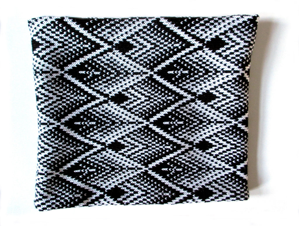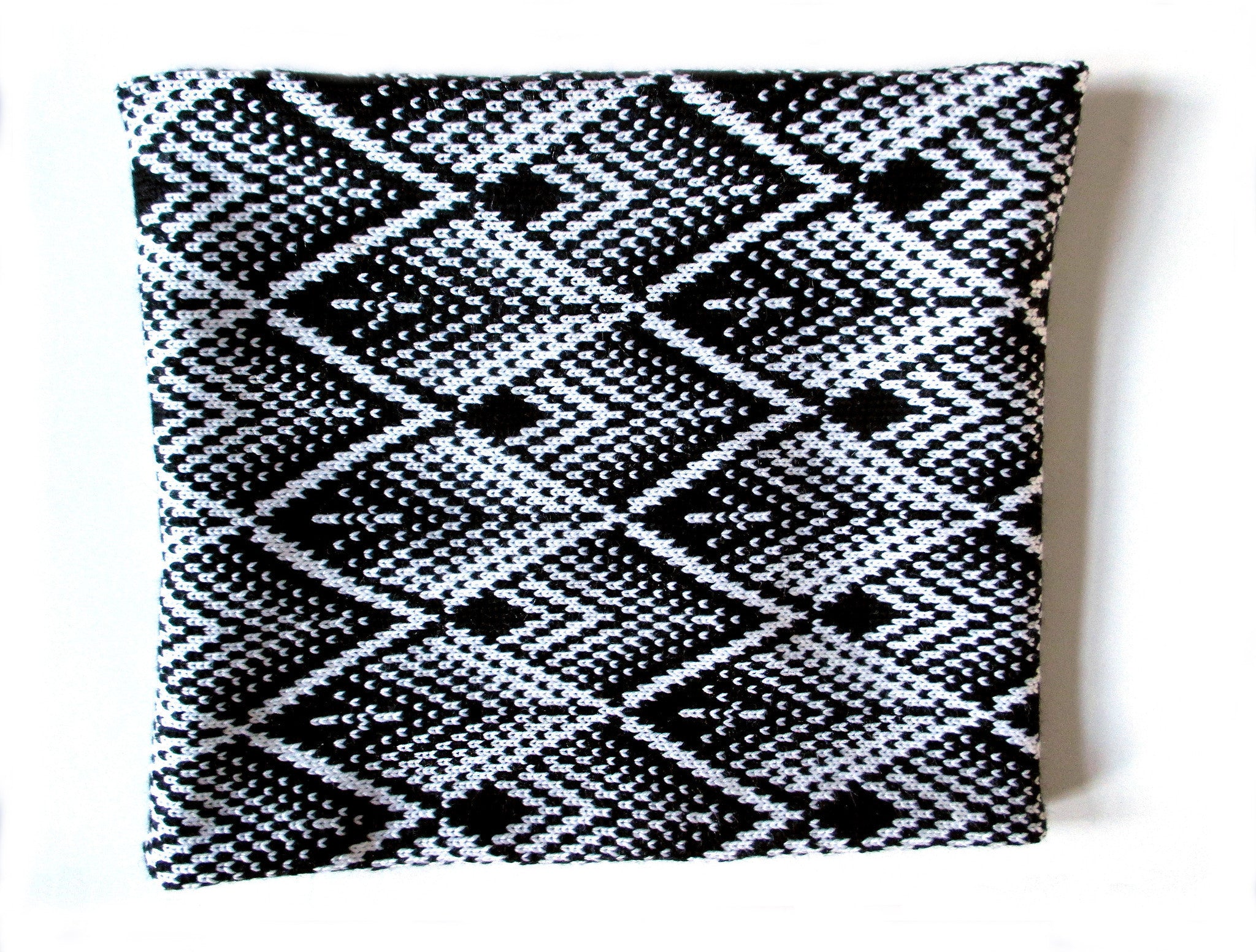 I love to play with colors and different patterns! Here is a knitted round scarf, the colors are black and white. It has a nice geometric pattern that will add some fun and fashion to your look. The scarf is double layered (which means it's also fully patterned inside and out), therefore extra warm and cozy.