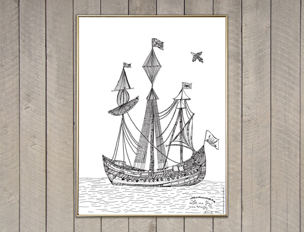 Black and white screen print of a pirate ship. Original illustration by Natacha Veen.
