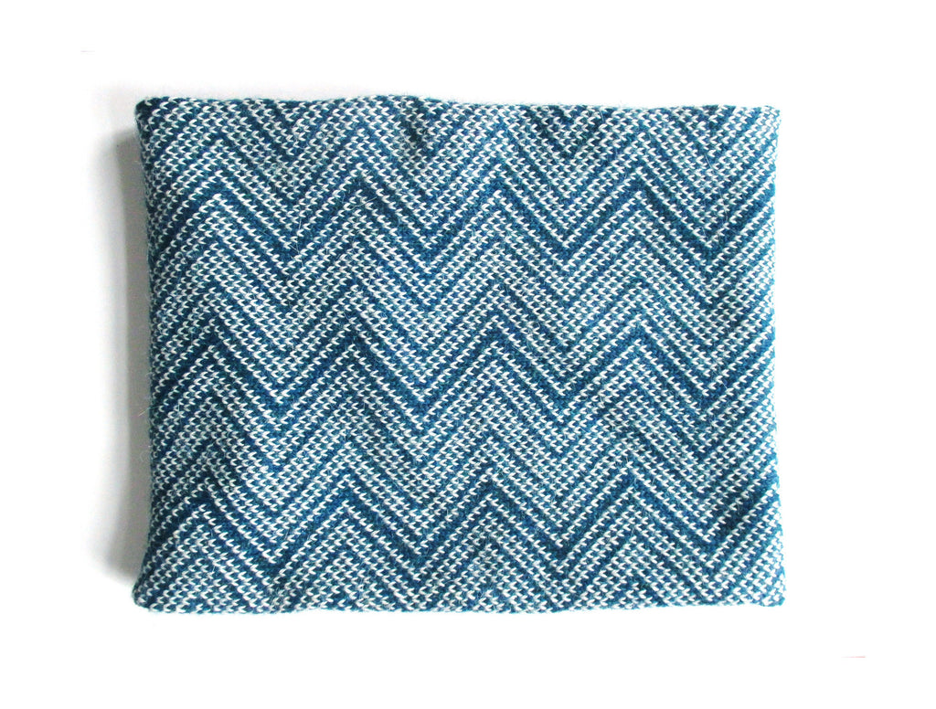This round scarf with a zig-zag pattern is made from pure alpaca wool. The colors are blue and pearl grey and the cowl is double layered(which means it's also fully patterned inside and out), therefore extra warm and cozy.