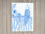 Screen print of two blue birds thinking. Original illustration by Natacha Veen.