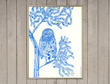 Screen print of a blue owl. Original illustration by Natacha Veen.