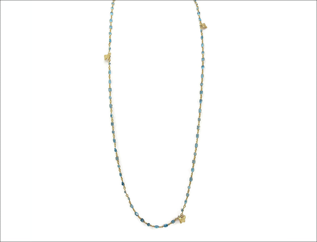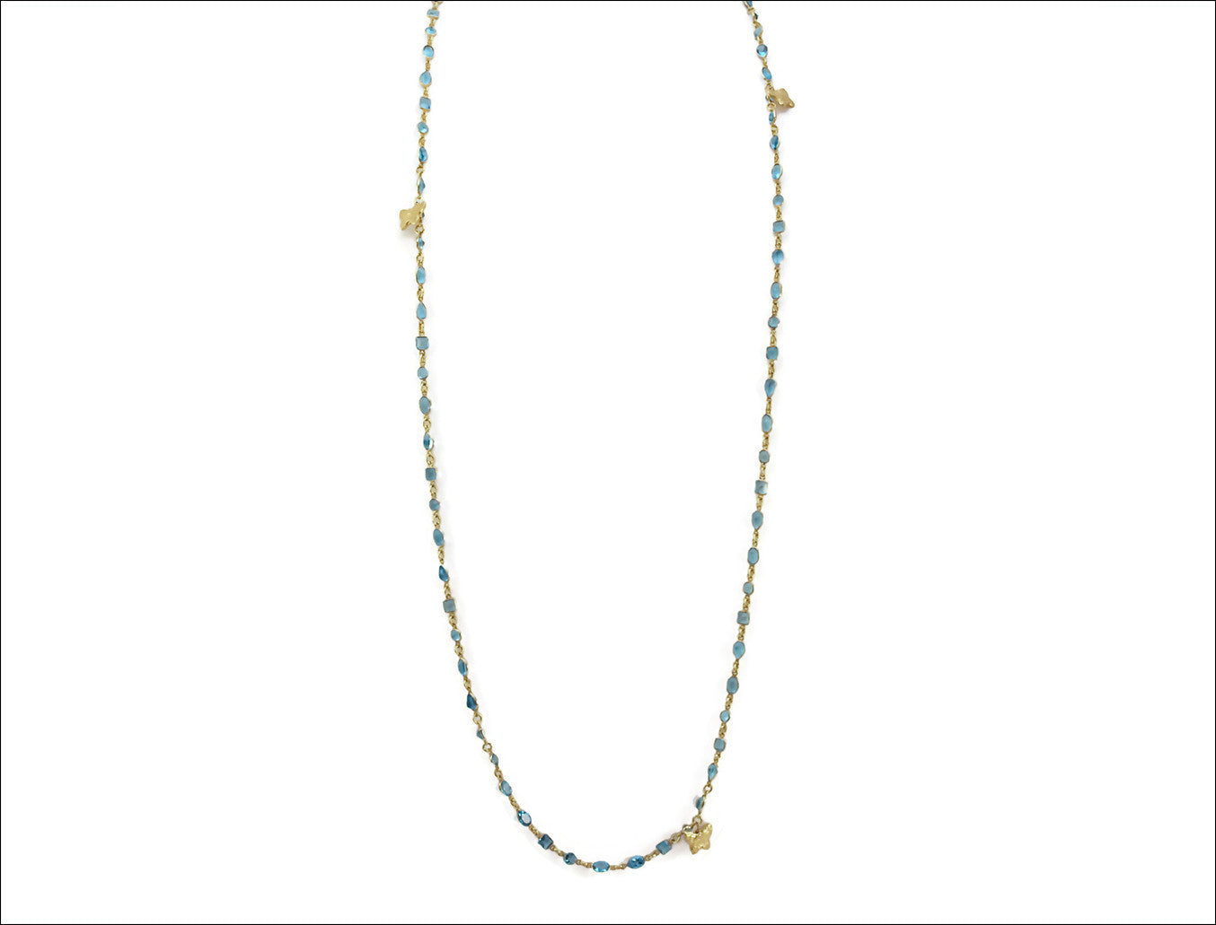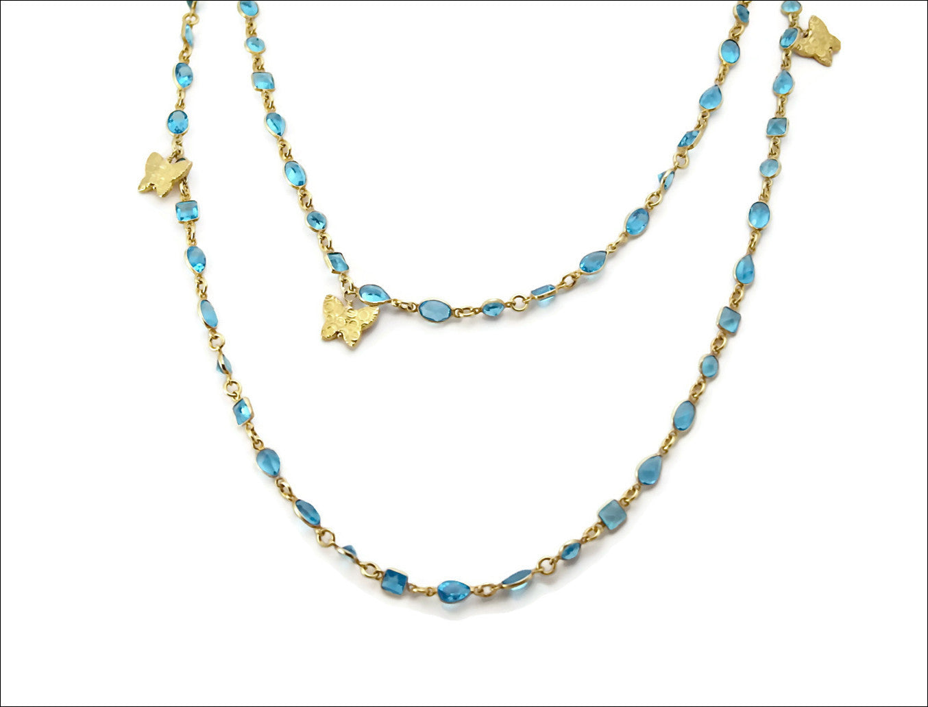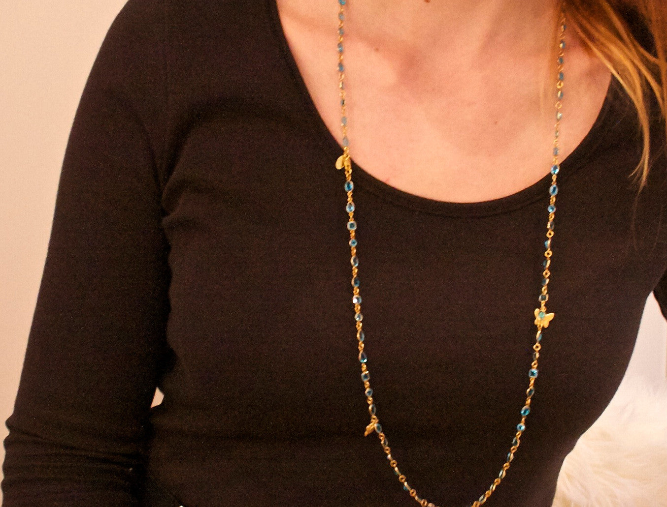 The Mirabelle Amy necklaces are so easy to wear on their own or stacked with other long necklaces. This Amy necklace has blue hydroquartz set in vermeil (gold-plated sterling silver) with vermeil butterflies along the piece. Its length is approximately 90 cm / 35.5 in and it features a regular lobster gold-filled clasp.