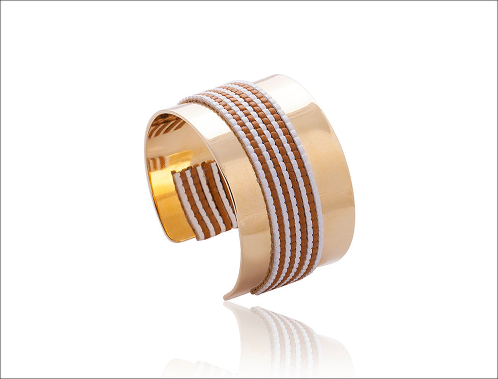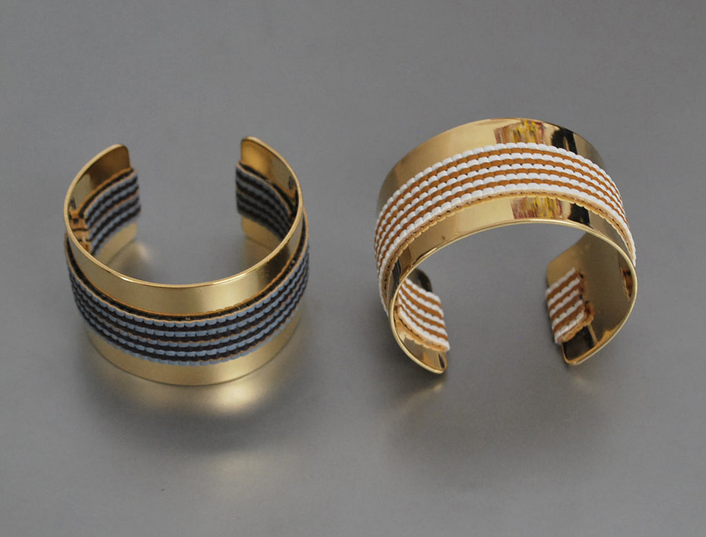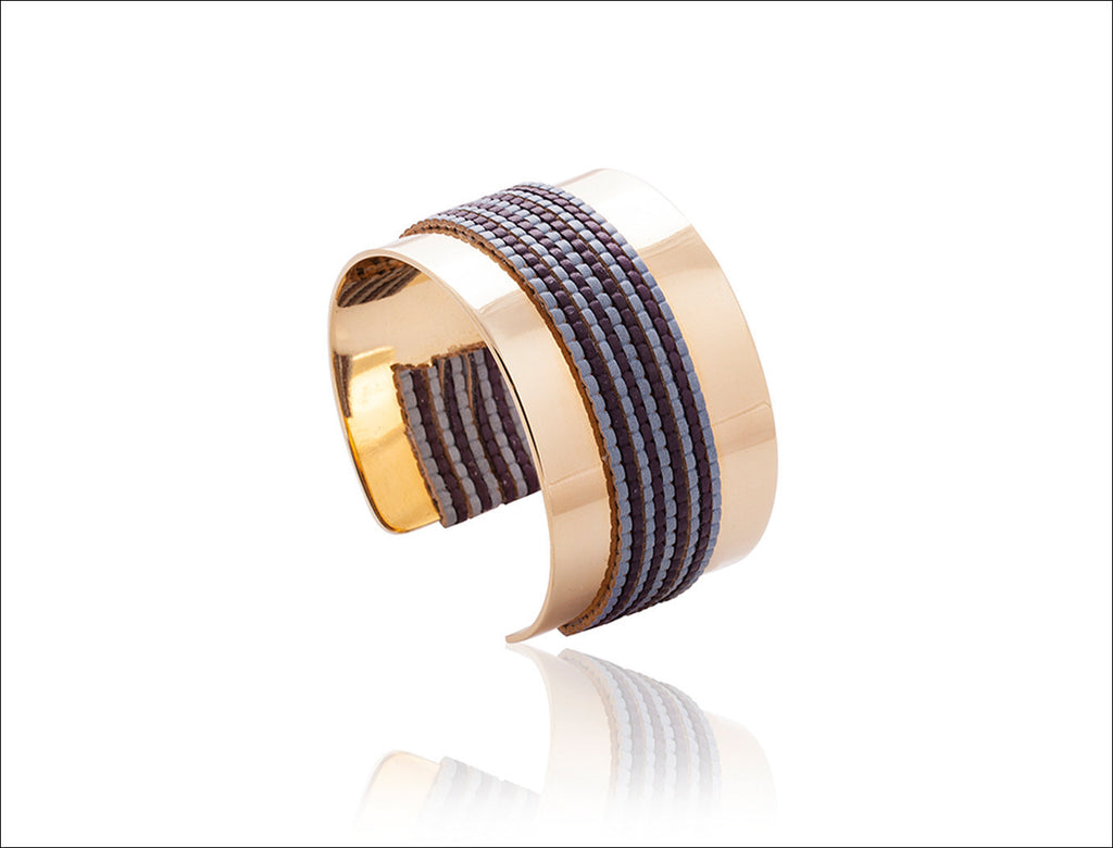 Elitis blue-toned faux leather straps snake around an open cuff bracelet. 24K gold-plated; 3.5cm.