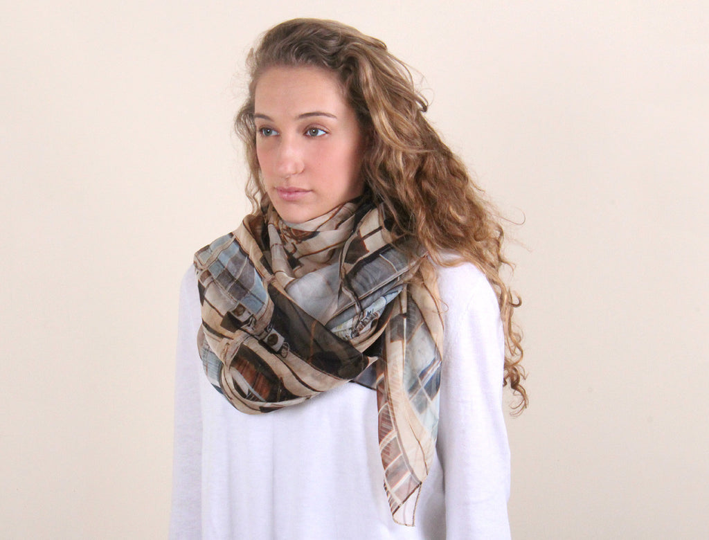 Printed on light as air silk chiffon, these colours are flattering and go with anything. This is the perfect scarf for wearing with jeans, a crisp white shirt and a big coat, or floating over a strappy dress at a party. I've done both!"