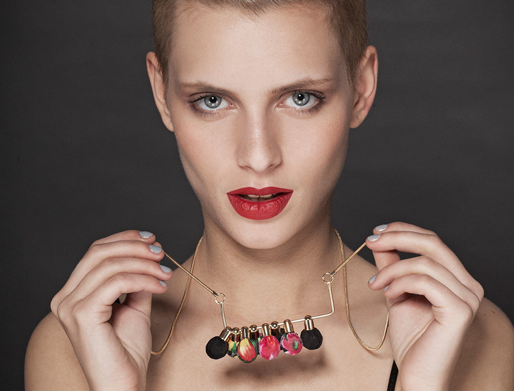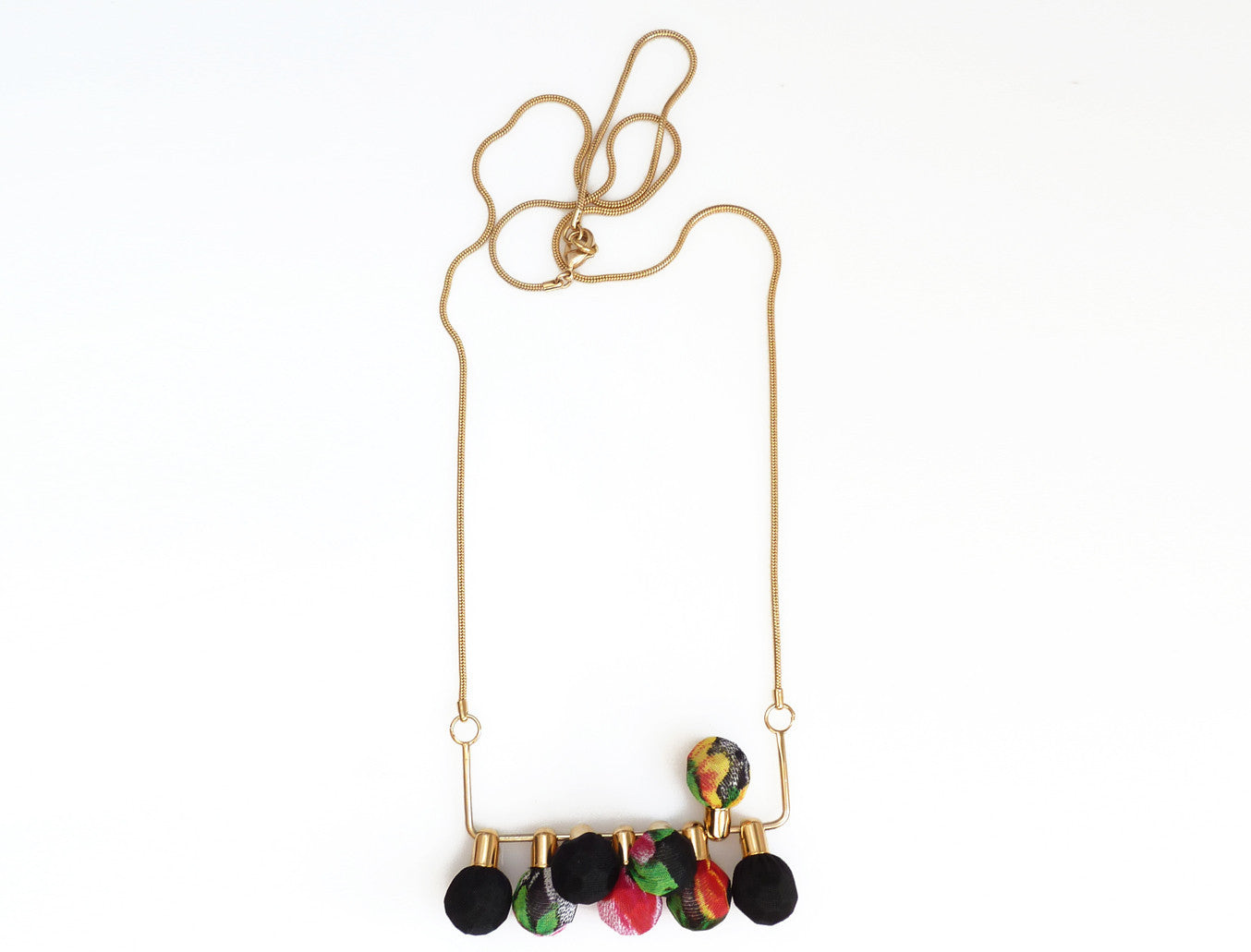 Long necklace centered around a pole with colored beads moving about. Fabric-wrapped Beads" are in constant motion on the pole, so it is playful and chic. Each bead is embedded in a metal part. The beads shine bright through the fabric.