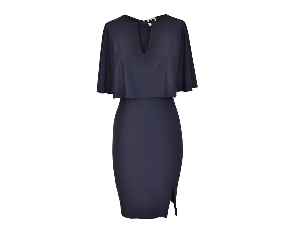 Navy color bodycon dress with cape made from bonded lycra fabric. It has a small slit at the hem line.