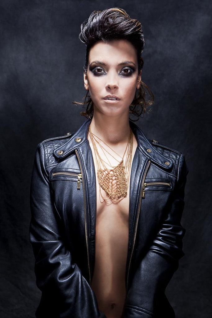 An asymmetric statement necklace. A center knitted net with a unique texture that reaches out around the neck with multi strands. The necklace is a strong statement to create an unforgettable appearance.