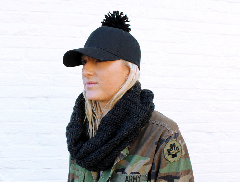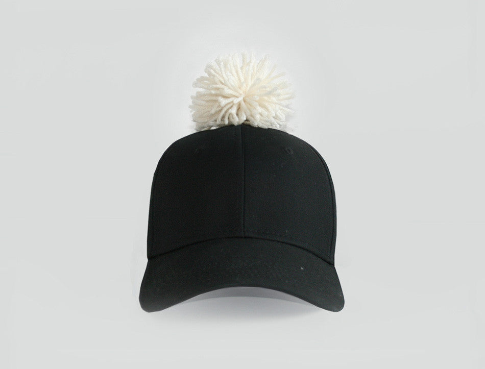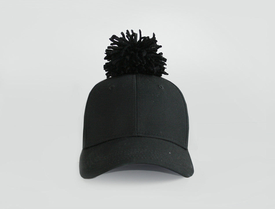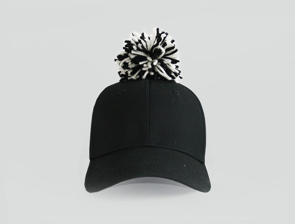 6 panel cotton baseball cap with a pom pom on top. Snapback closure.