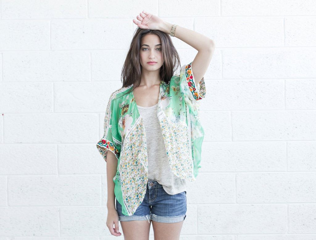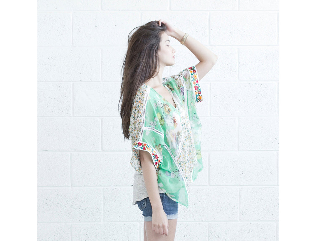 This cropped kimono has a special combination of floral fabrics in shades of green, and a perforated cotton trim in the seams of the kimono. Beautiful flowers embroidered trim along the hem of the sleeves and in the center of the back. It