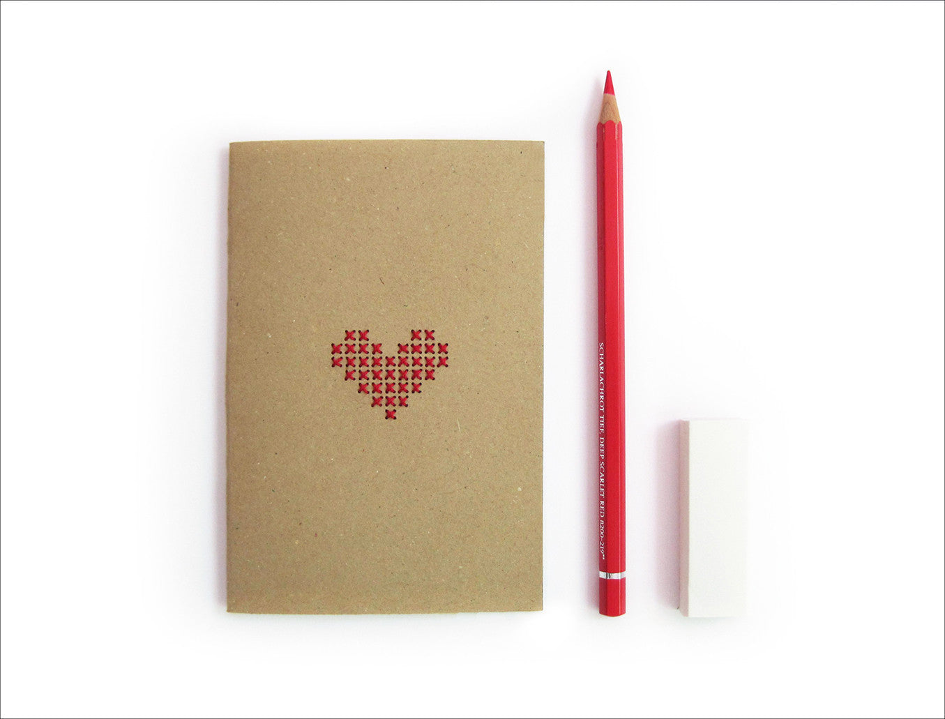 One blank A6 hand stitched notebook with cross stitch heart on the front cover. On the back cover there is a small cross stitch heart printed. Red thread.