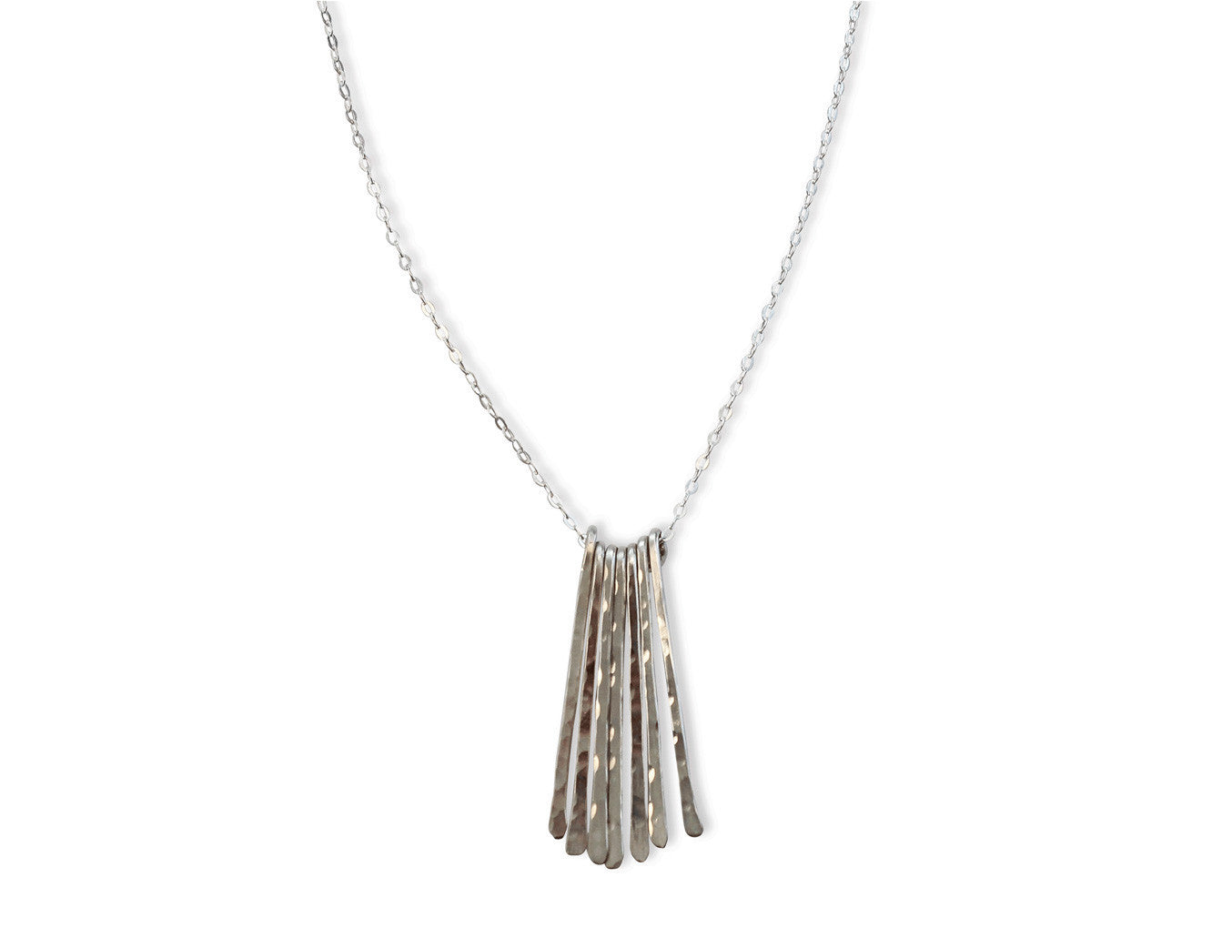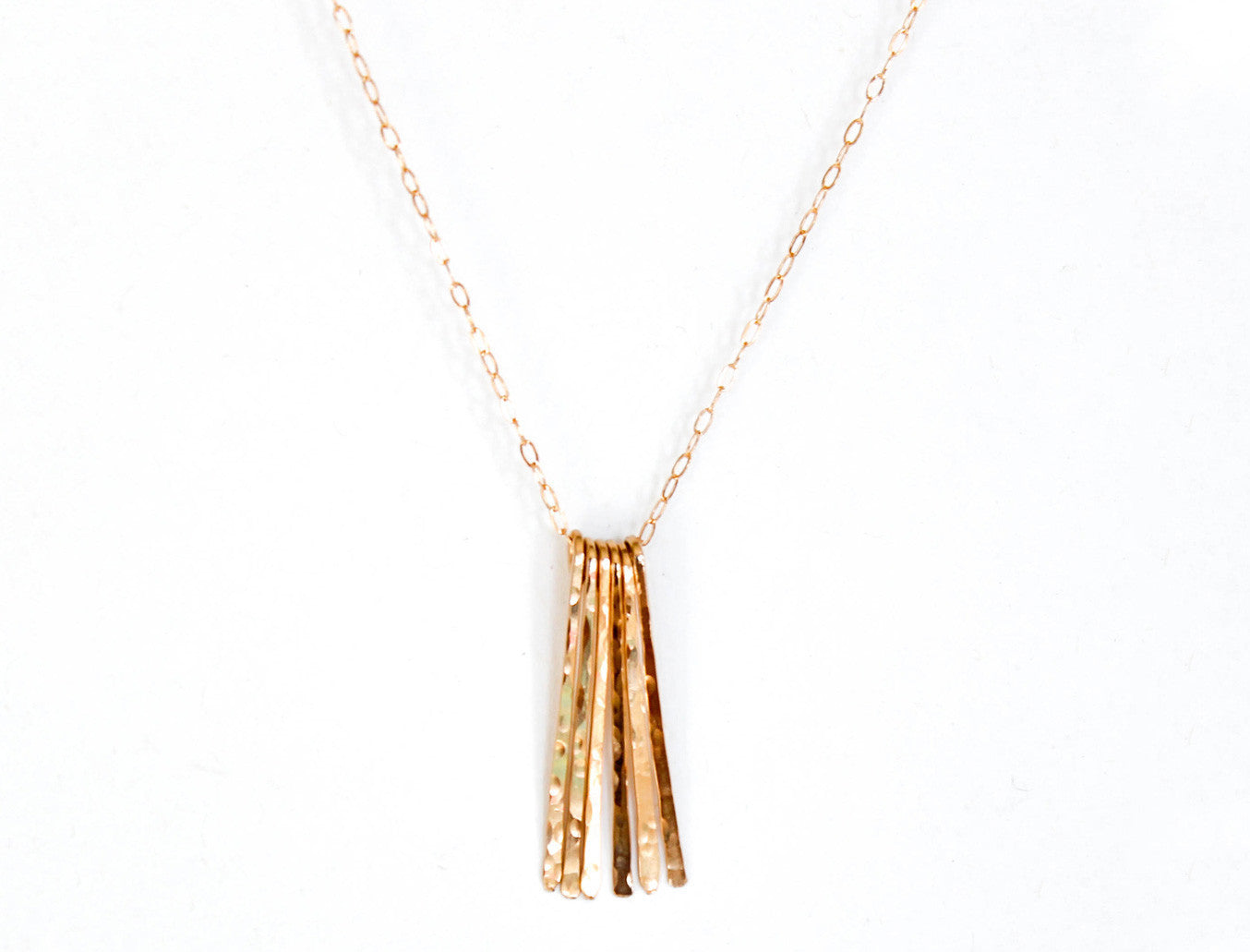 Six hand-hammered 14K gold filled, rose gold filled, or sterling silver pieces fall from a 14K gold filled or sterling silver chain. The strips create a beautiful fan-like shape that reflects light beautifully. This necklace is very versatile - it can be dressed up or down, and is amazing to layer with our longer pieces and double wrap necklaces. This pendant's ability to move and reflect different segments of light really reflects the high quality of the materials.