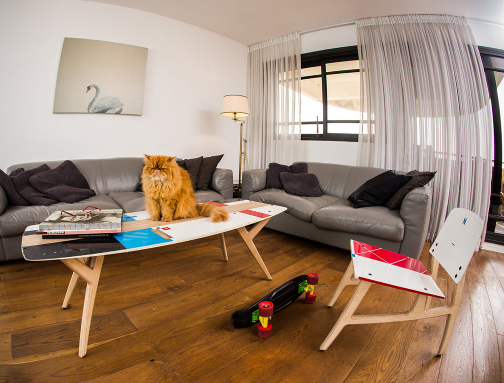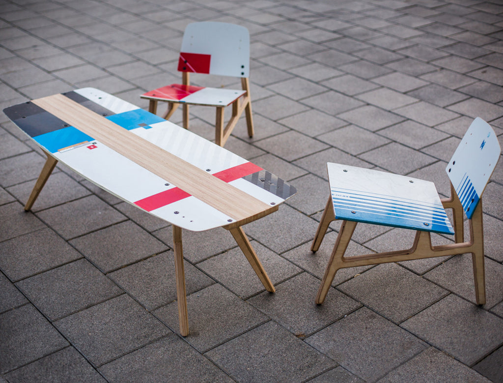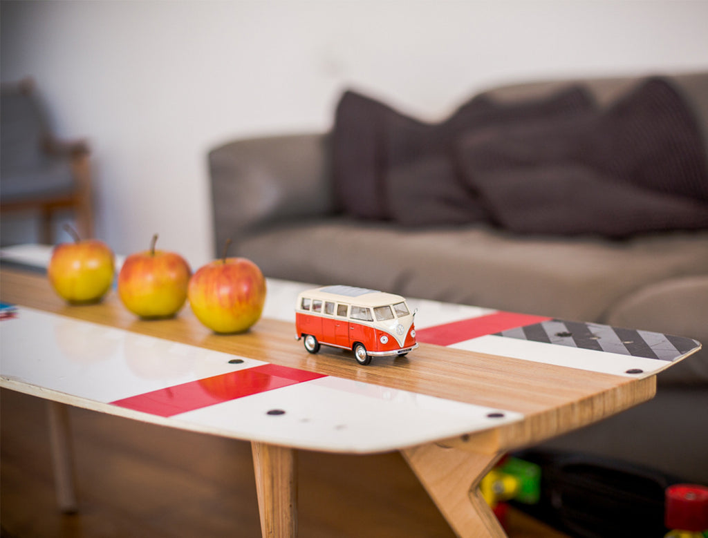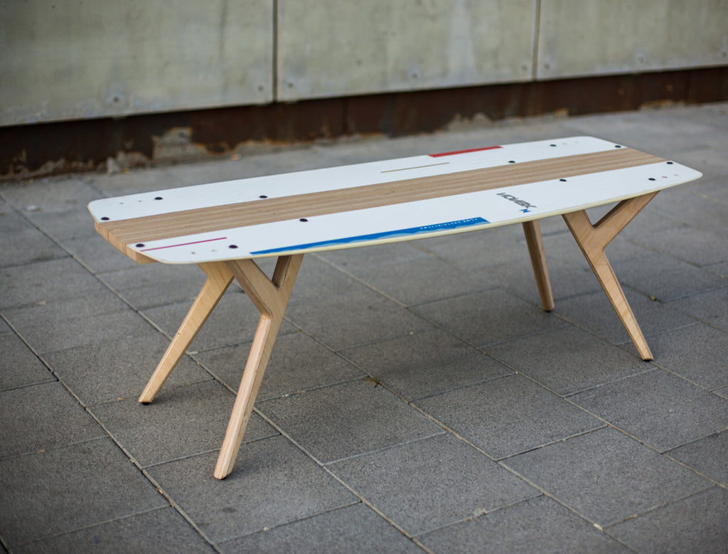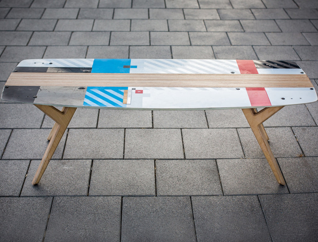 A coffee table made out of a used, unserviceable kite board and plywood. The board is not recyclable due to the materials it's made of.