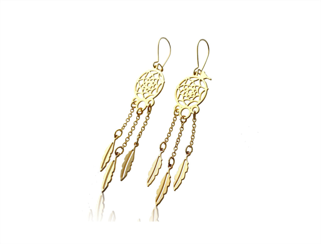 A striking Mexican inspired dream catcher pendant and 3 dangling chains with feathers, hanging on a medium size earwire. Made of high quality 24K matte gold plating over brass base.