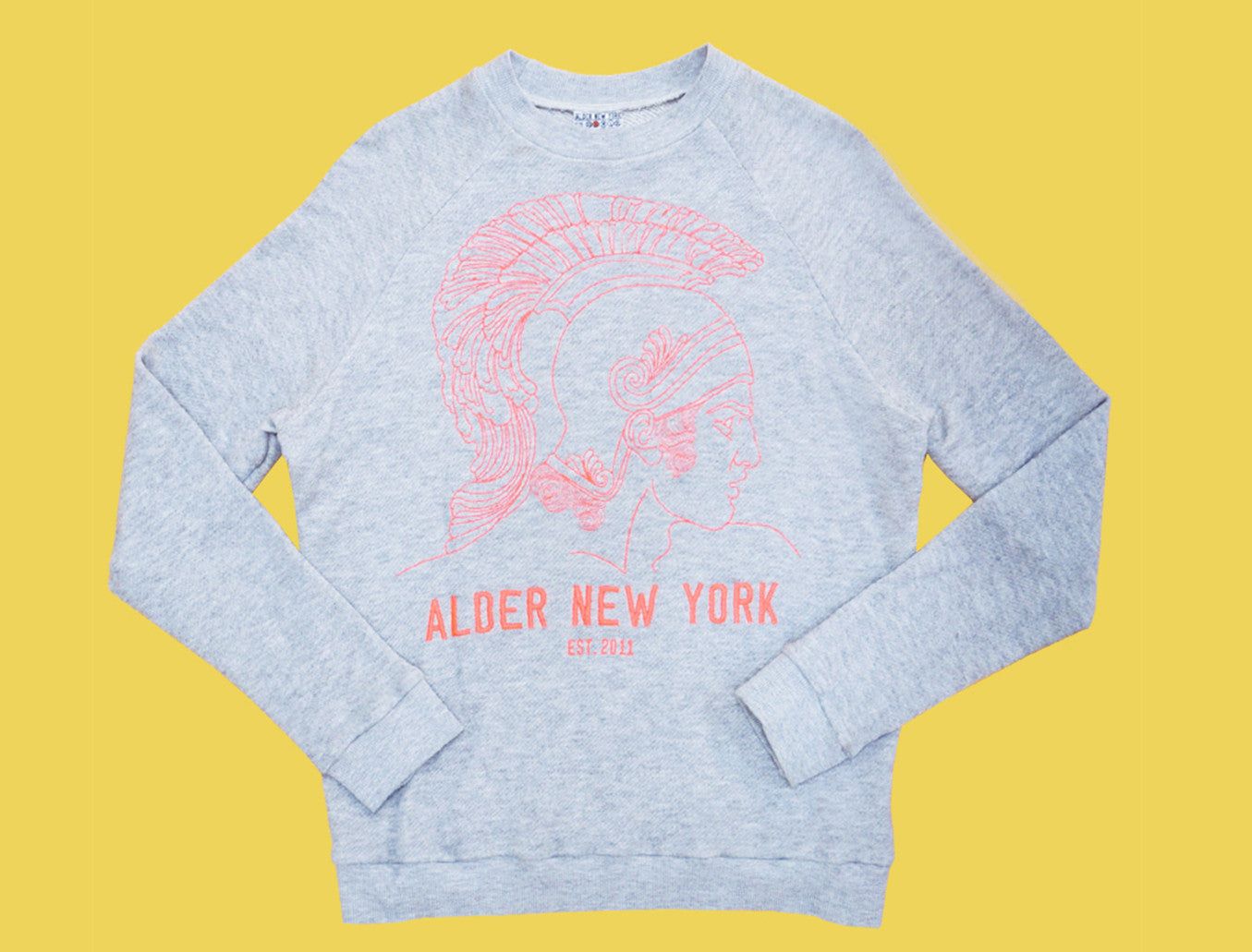 Alder New York's Embroidered Sweatshirt is constructed of a light weight 65% cotton / 35% rayon heathered grey French terry knit. Our comfortable and easy raglan sleeved sweatshirt features an embroidered neon orange Spartan graphic and Alder New York logo.