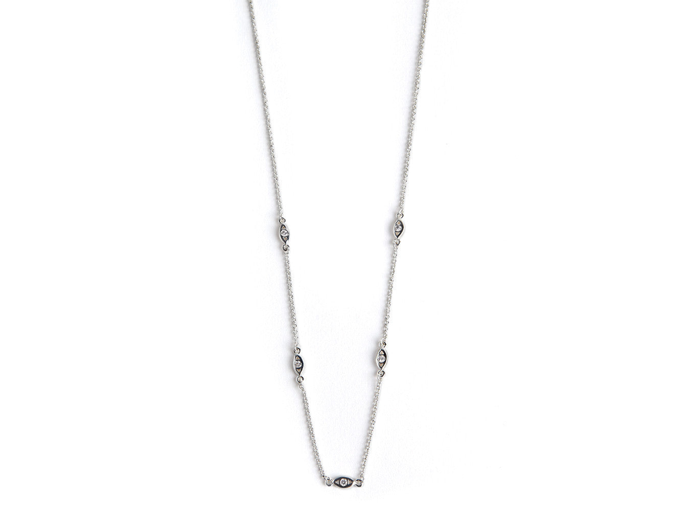 Plain 925 Sterling silver necklace, set with 5 round shaped, transparent crystals in a tiny eye. Available with rhodium plating, 18K rose plating, or 18K yellow gold plating. One size.