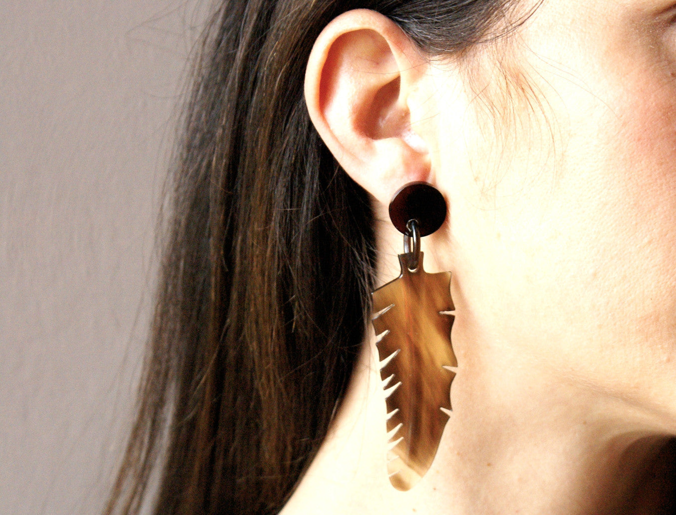 The Feather earrings are part of Maria-Xuan's collection "Inspired by Nature" and represent baby eagle feathers. Their design is enhanced by the various nuances of horn, from dark brown to beige. Some pairs can be lighter or darker. The top of the earrings is a buffalo horn circle which conceals the ear lobe.