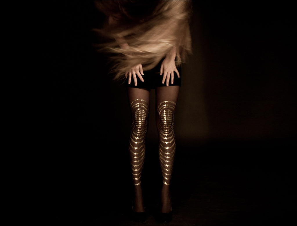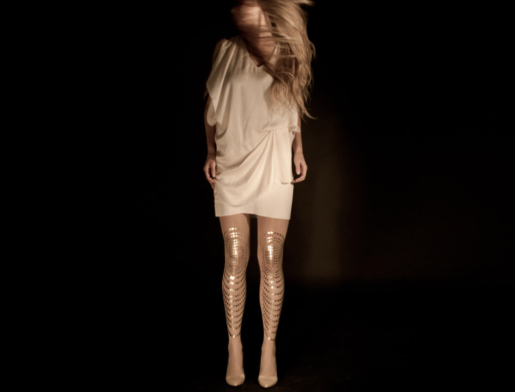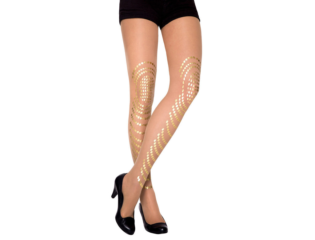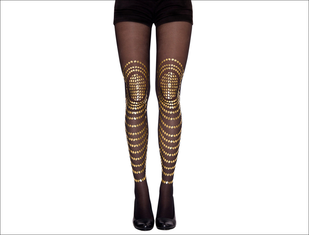 The Goldfish model was initially designed for Wild Collection & was inspired by fish scales. It is now also part of the Flash Back Collection, which is our sheer tights collection. This model is very popular and that's why we wanted to give our customers versatile options to wear it. It has a rock 'n roll vibe to it, and it attracts a lot of attention to the wearer. It is printed by hand.