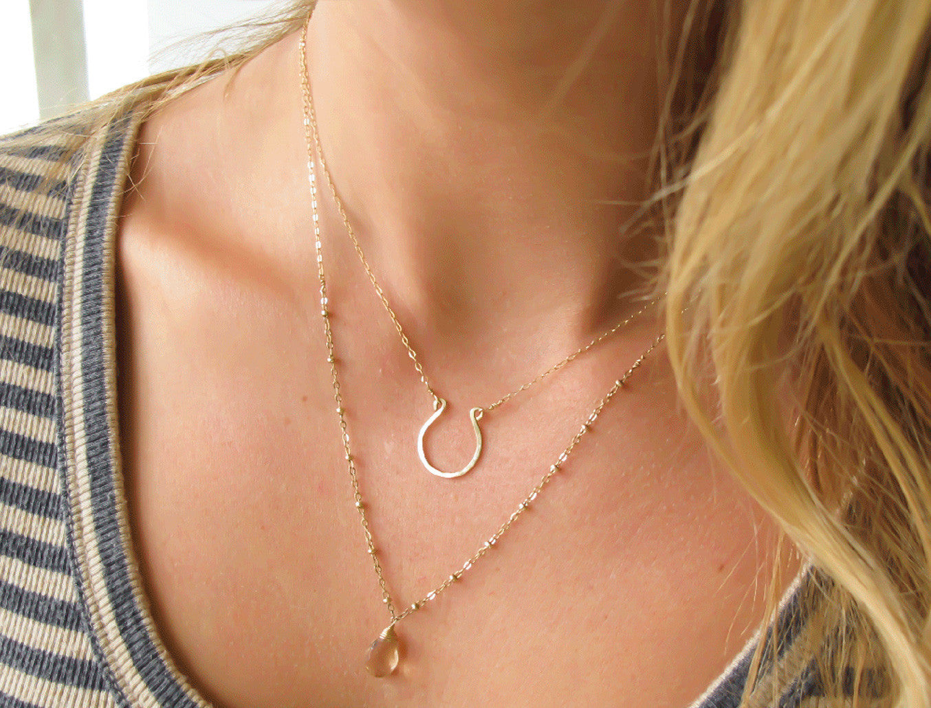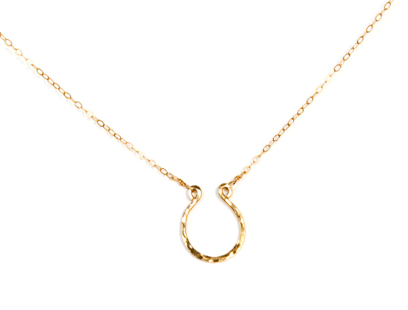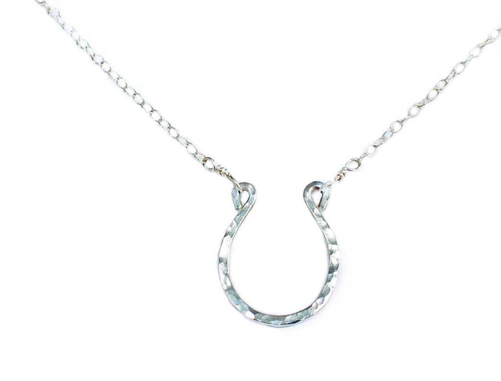 A handmade horseshoe is suspended by a sparkling 14K gold filled or sterling silver chain. The pendant is hand shaped, hammered, and polished to a glittering finish. The hammered surface of the horseshoe gives it a gorgeous organic appearance and allows it to reflect light from any angle.