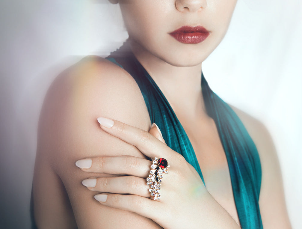 Inspired by Gota de Aceite emeralds. Gota de Aceite, Spanish for "drop of oil," refers to the highly unusual and coveted inclusions that give some emeralds a velvet look. Swarovski crystals and crystal cabochons set in 24k gold plate.