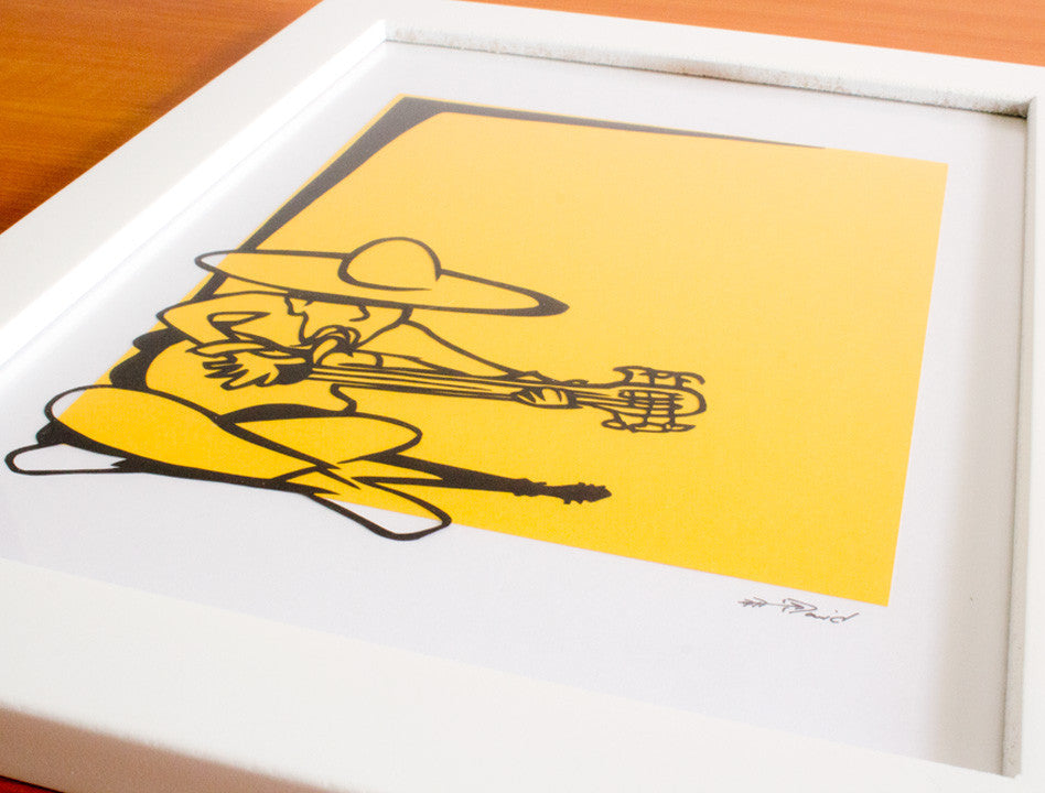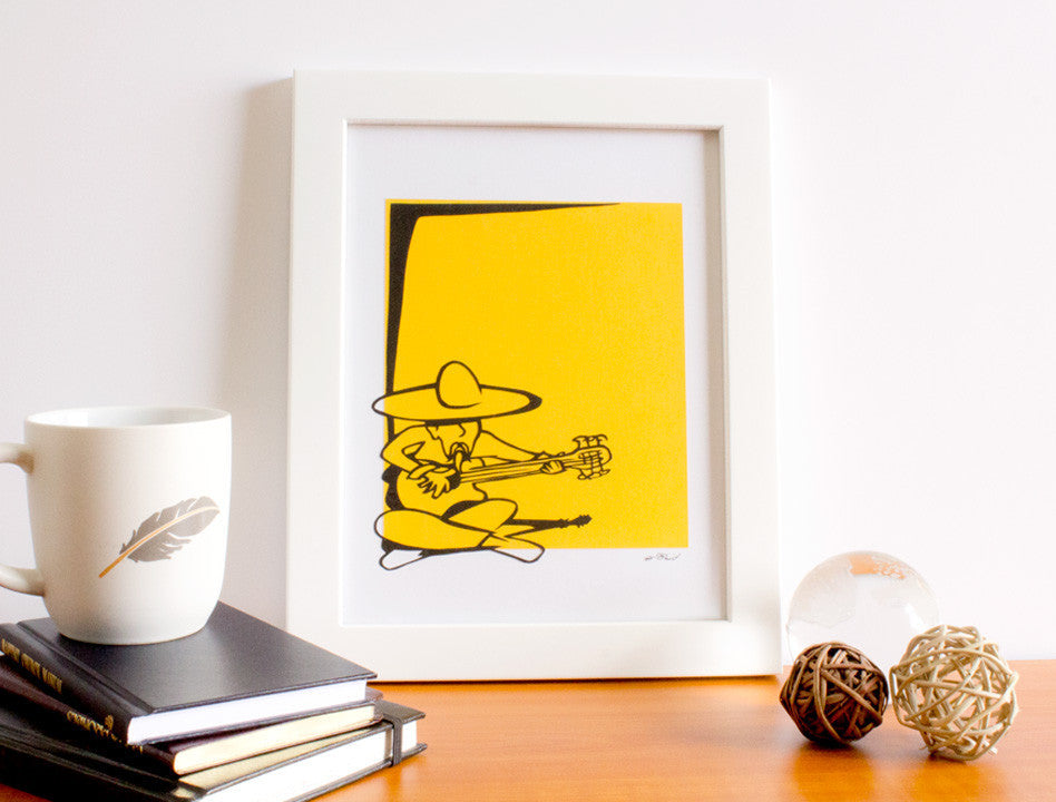 This is a paper cut out piece made entirely from paper. Using only three different sheets (one black sheet, one colored sheet, and one white background sheet), the piece evokes the spirit of music through color and imagery. The character is cut out of a single sheet of black paper using only an Xacto knife and plenty of patience!