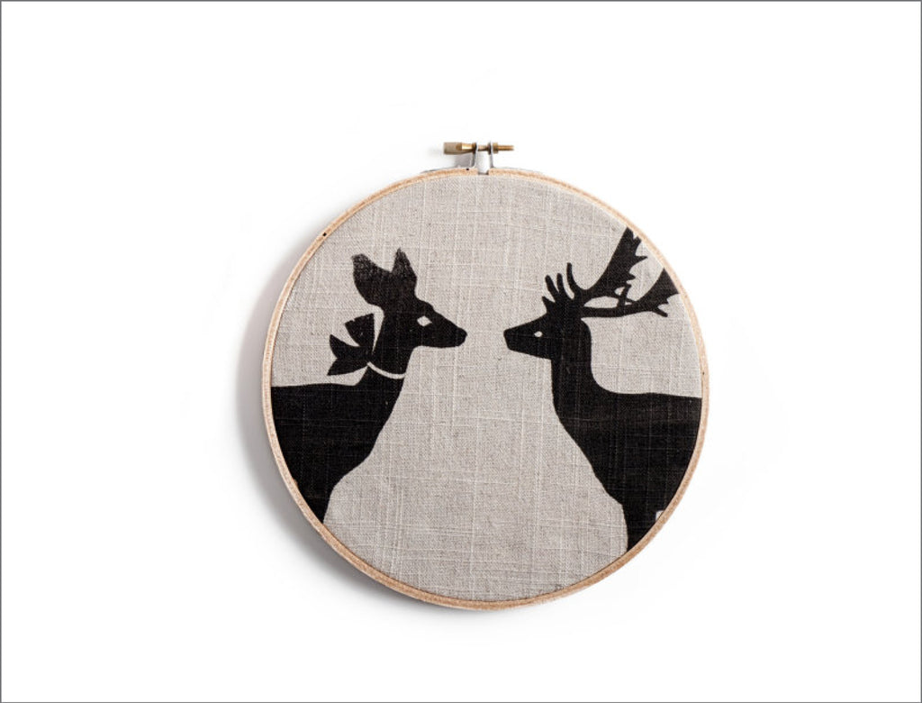 This is a unique screen print of a deer and doe. It is hand screen printed in dark brown ink on natural linen and stretched in a wooden embroidery hoop, ready to hang.