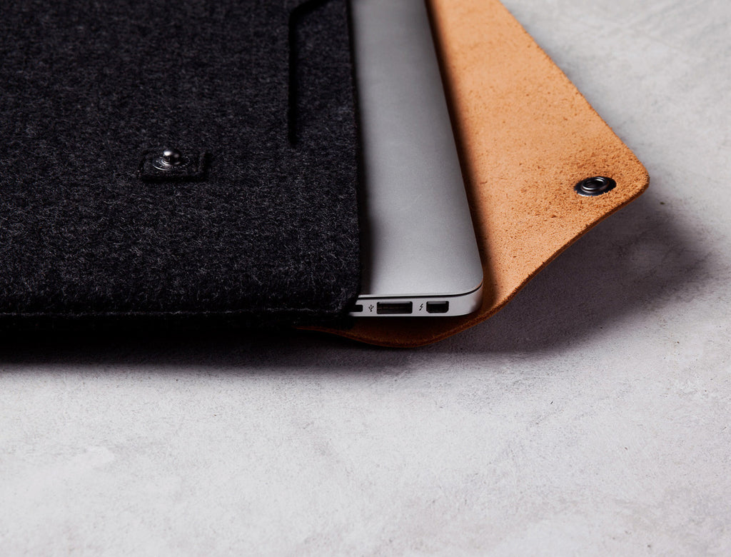 Crafted out of a unique combination of felt and vegetable-tanned leather, this quintessential sleeve has been designed to fit both the 13” Macbook Air and 13” Macbook Pro Retina.