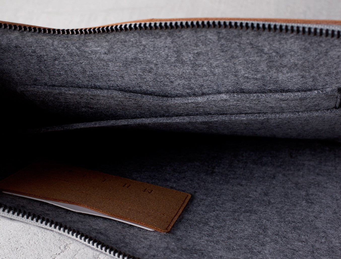 The 13” Macbook folio has a powerful and seductively understated presence. This is due in considerable part to the noticeably large surface of tan-colored high quality vegetable-tanned leather on the front of the sleeve. This creates a deliberate and powerful contrast with the large surface of light grey felt on the back, separated by a high quality custom-built gunmetal alloy zipper alongside the sleeves edge, following a subtle curve – a calm hint of craftsmanship.