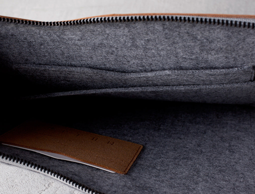 We started with the core, the materials, and developed every component with the highest possible attention to detail. When you take the sleeve in hand, you’ll instantly notice the quality of the materials. This sleeve has been crafted out of a unique combination of felt and full-grain vegetable-tanned leather.