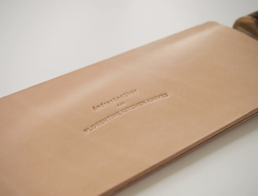 Knives come with a leather and wood blade guard (available in 3 colors: Black, Brown or Tan), and are packed in individual wood boxes. The blade guards are made by Tel Aviv ArtSetters Andrey and Shay.