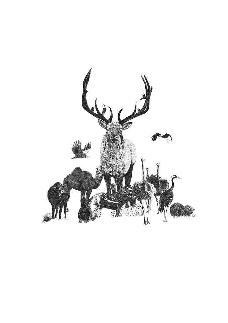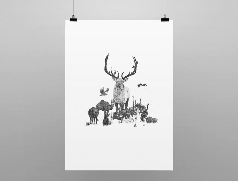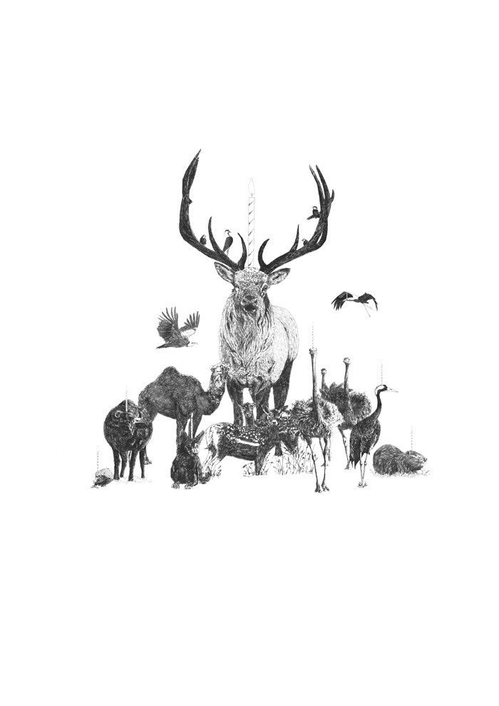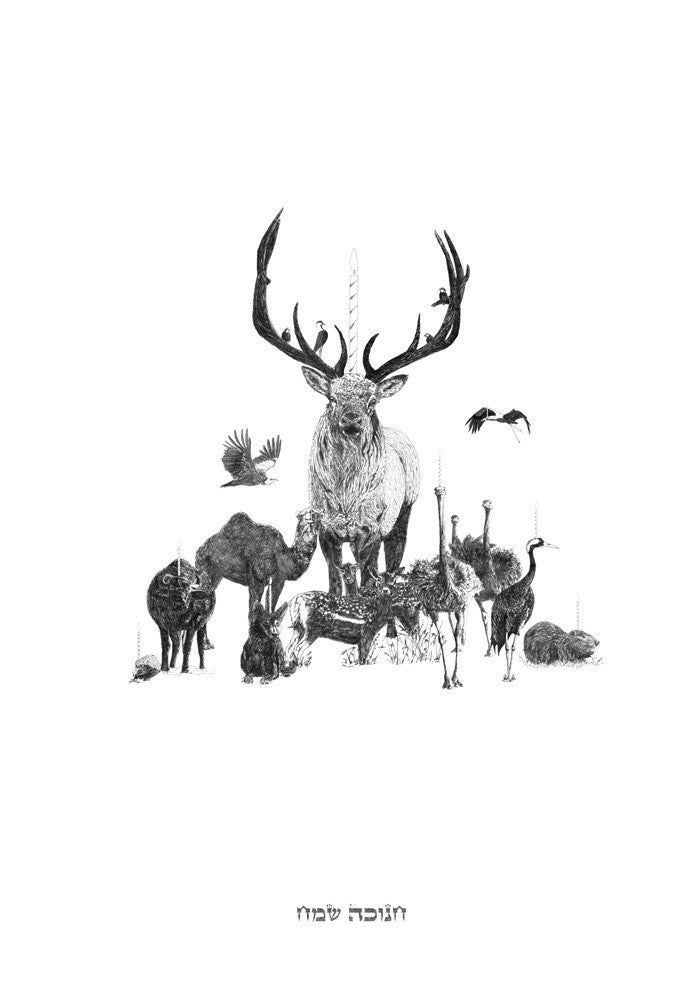 A collage of animal illustrations combined to celebrate the Christmas and Hannukah (a version with Hannukah candles is offered aswell). The poster is the main piece of the new greeting card collection.