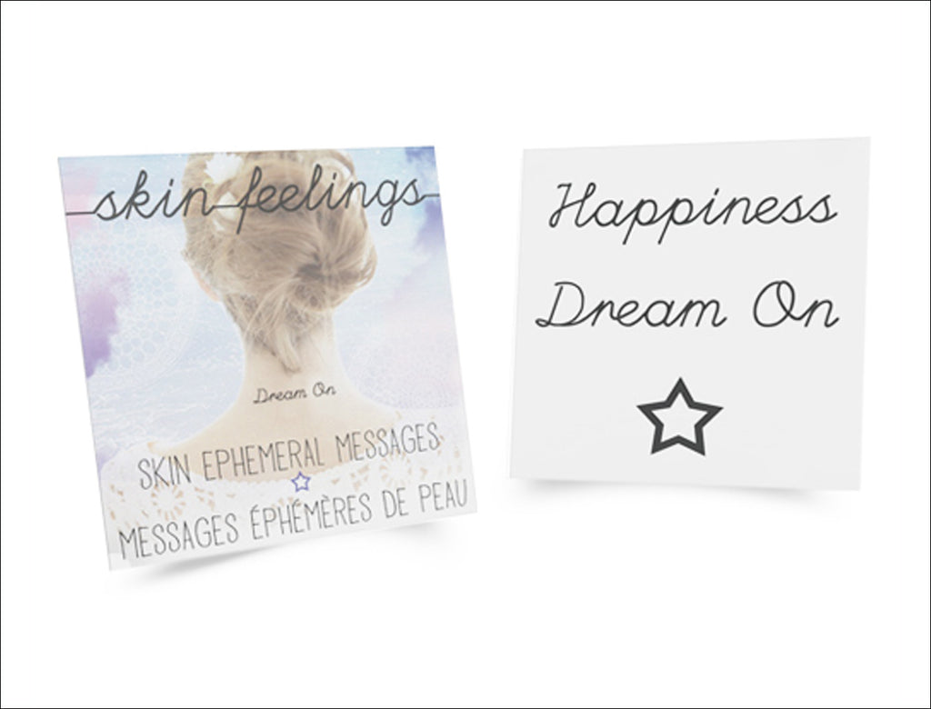 Set of 3 Ephemeral Tattoos: Happiness, Dream On, and star symbol.