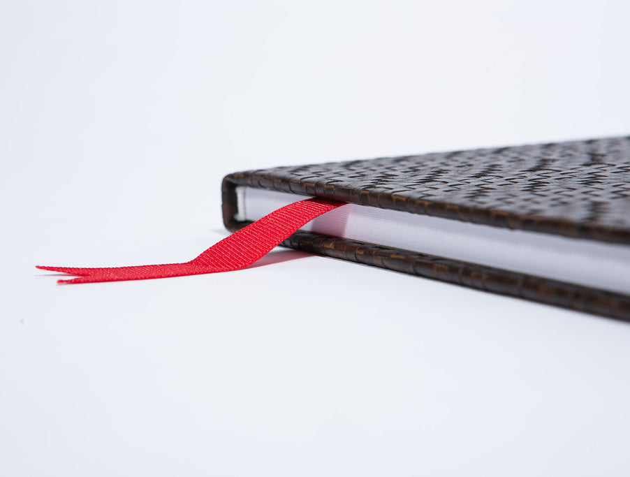 Wrapped in a woven chocolate brown bonded leather, this artfully crafted hardcover book travel case for the iPad features a red grosgrain bookmark for easy iPad removal, the S&H monogram endsheet for screen protection, and authentic book signatures—perfect for the distinguished and scholarly look. Made in America. Patent pending. Limited quantities available.