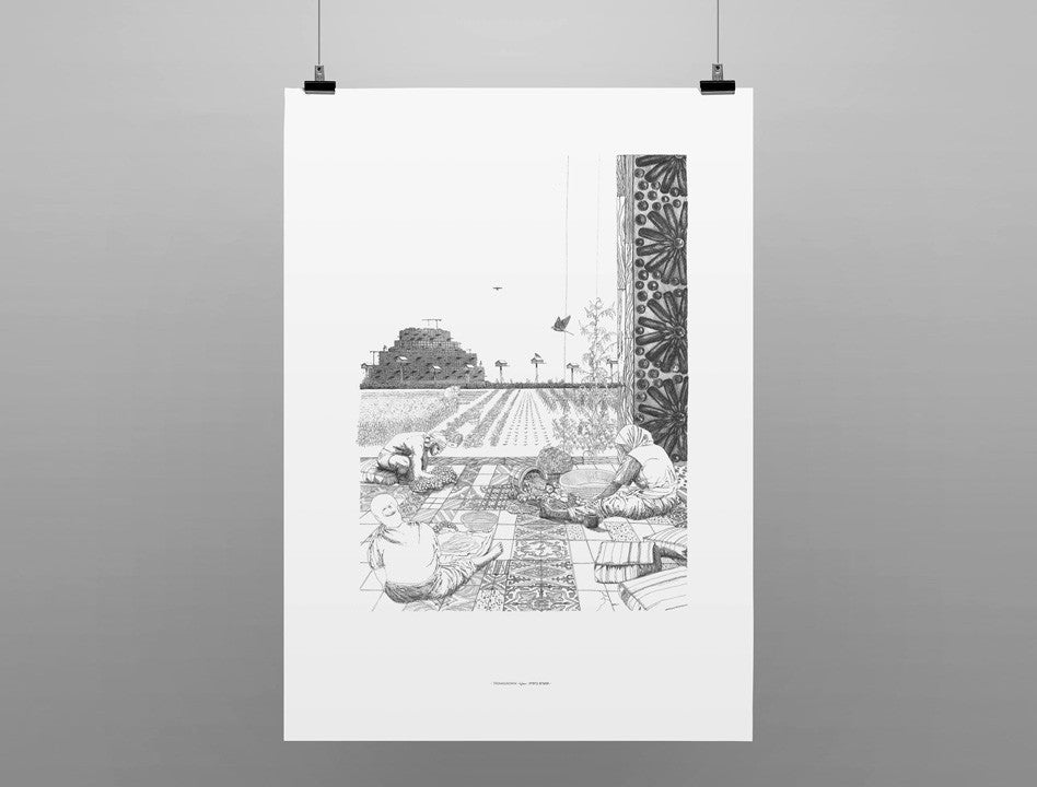 A drawing made as part of a "Smartcities" Architecture Studio class dealing with a new UN mission for peace between Israel and Palestine through the recycling of waste. The drawing depicts the sorting of food grown on top of a recycled waste mountain and the interior of one of the housing units.