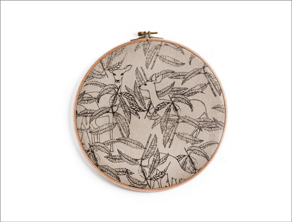 This is a unique screen print of a deer and doe. It is hand screen printed in dark brown ink on natural linen and stretched in a wooden embroidery hoop, ready to hang.