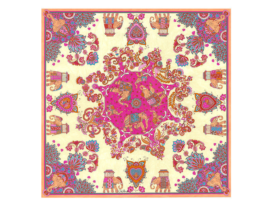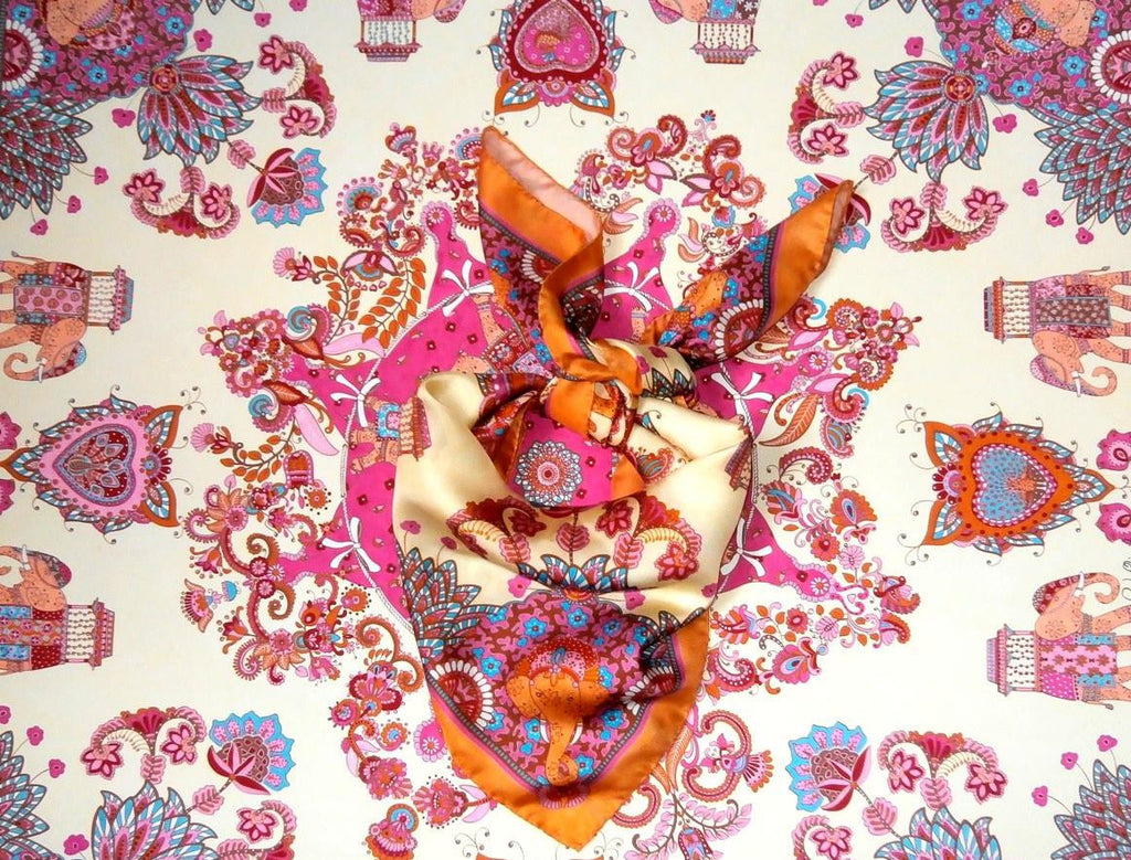 Beautiful hand-rolled scarf 100% silk twill.  The scarf is drawn inspiration from India.  The pattern has been hand drawn with gouache. ... More