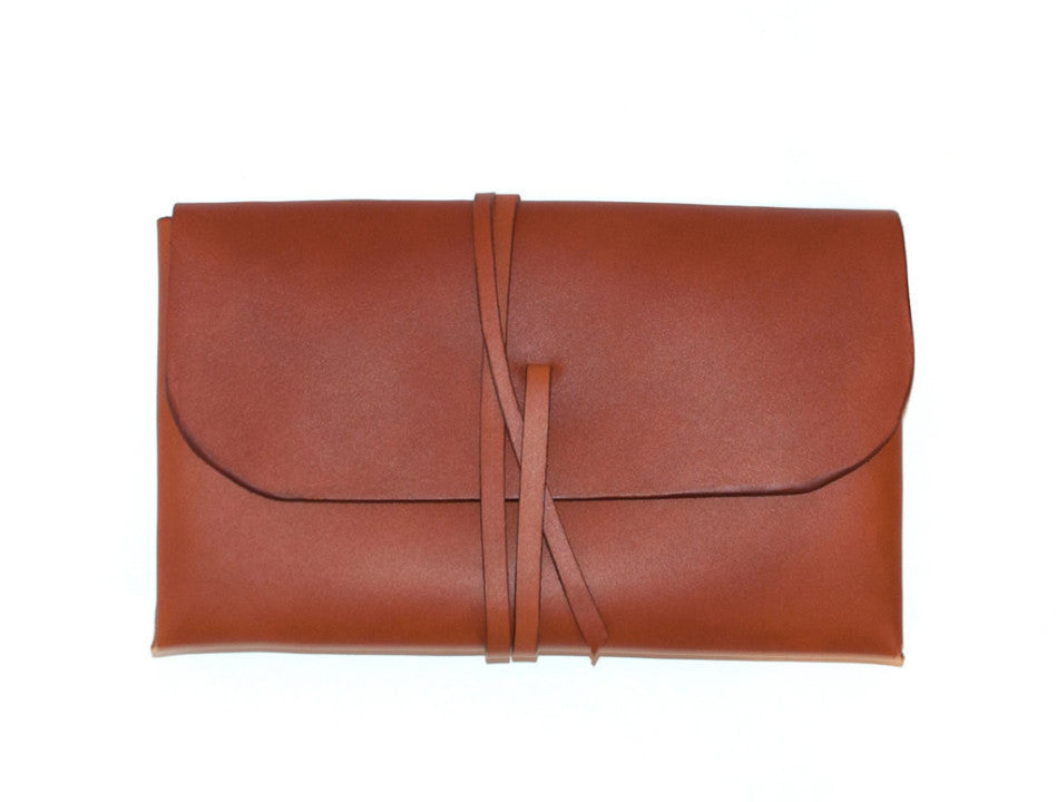 The one-piece constructed clutch is hand-stitched using waxed linen thread for longevity and durability.